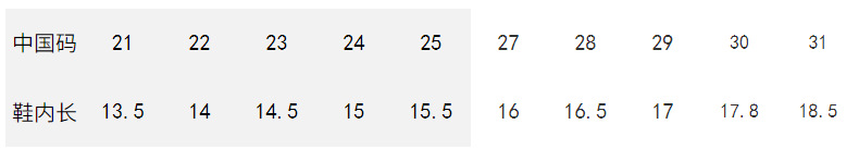 21码内长13.5厘米.22码内长14厘米.23码内长14.5厘米.24码内长15厘米.25码内长15.5厘米.27码内长16厘米.28码内长16.5厘米.29码内长17厘米.30码内长17.8厘米 31码内长18.5厘米 32码内长19.5厘米 33码内长20.厘米 34码内长20.5厘米 35码内长21.5厘米 36码内长22厘米 推荐脚长+1厘米=鞋内长