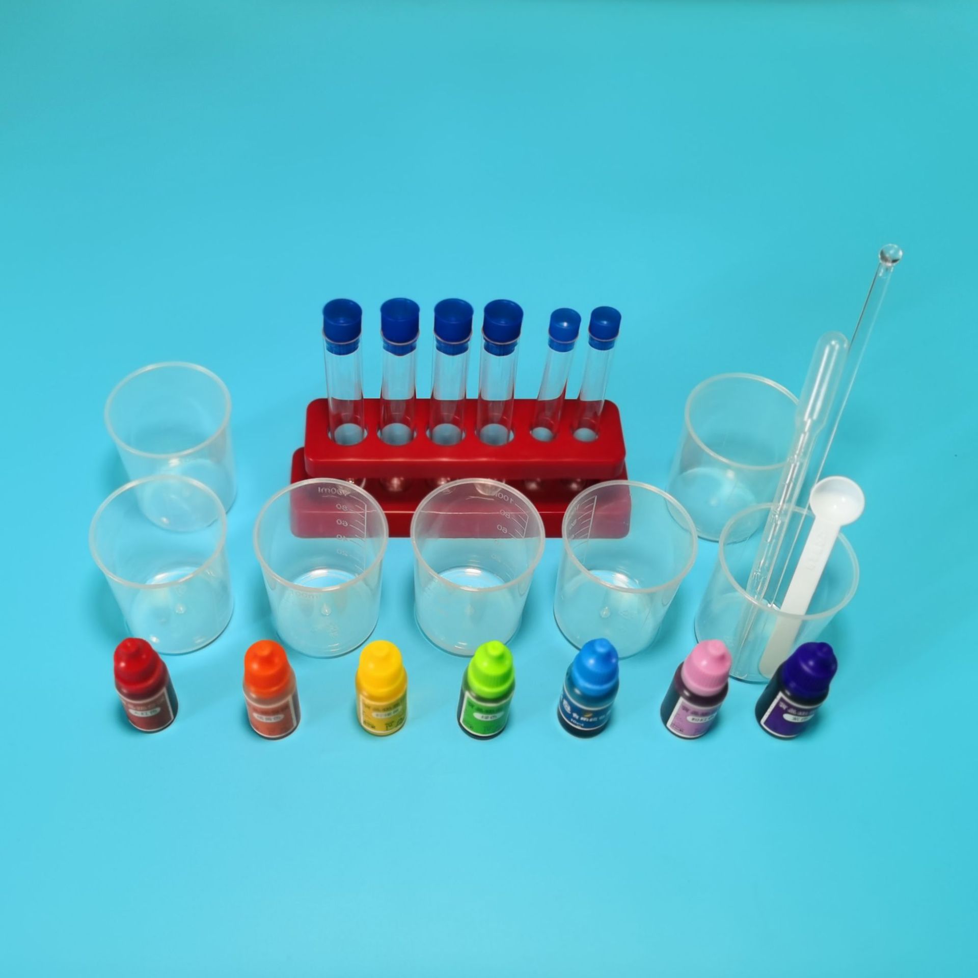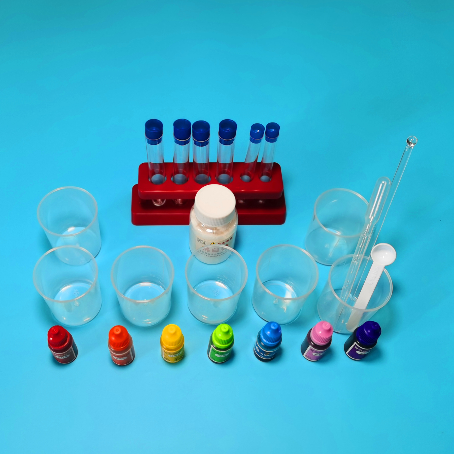 实验材料:色素、试管、量杯(3个)、滴管、取样勺、白糖、清水