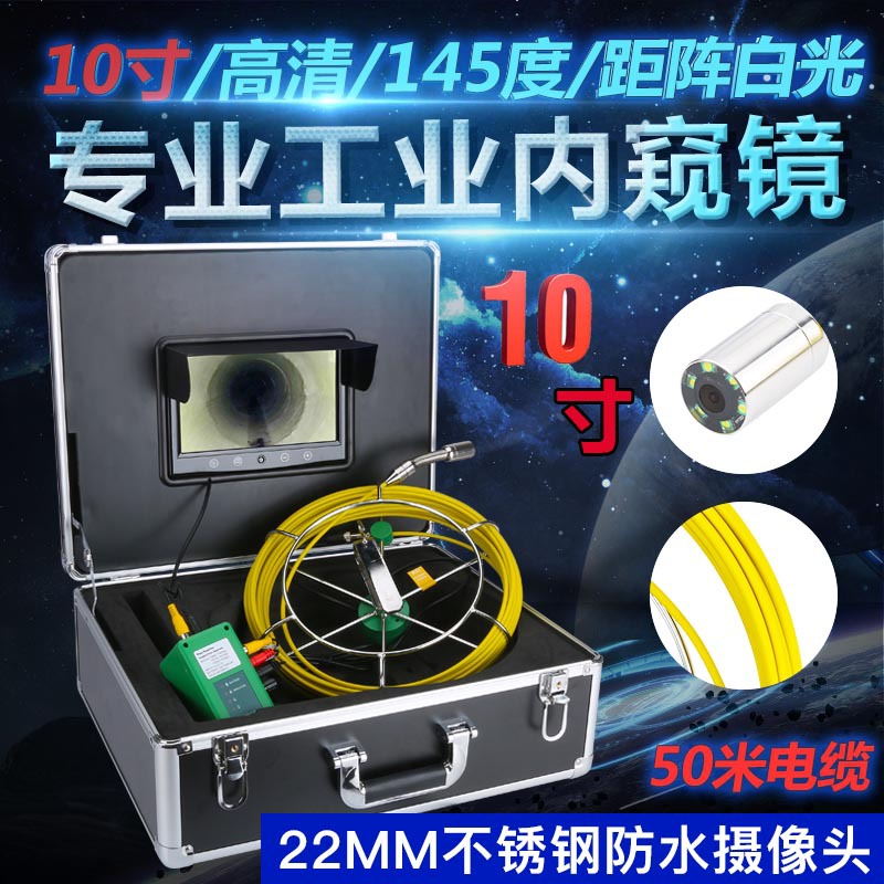 型号:F9400-50M 配置:10寸屏,直径22mm探头,高清1000线 ,镜头角度145度,50米管道内窥镜,4500MA内置电池,带电量显示,灯亮度可调,保护套38MM,补光灯6颗6W距阵白光,线直径5MM,电池续航约8小时。