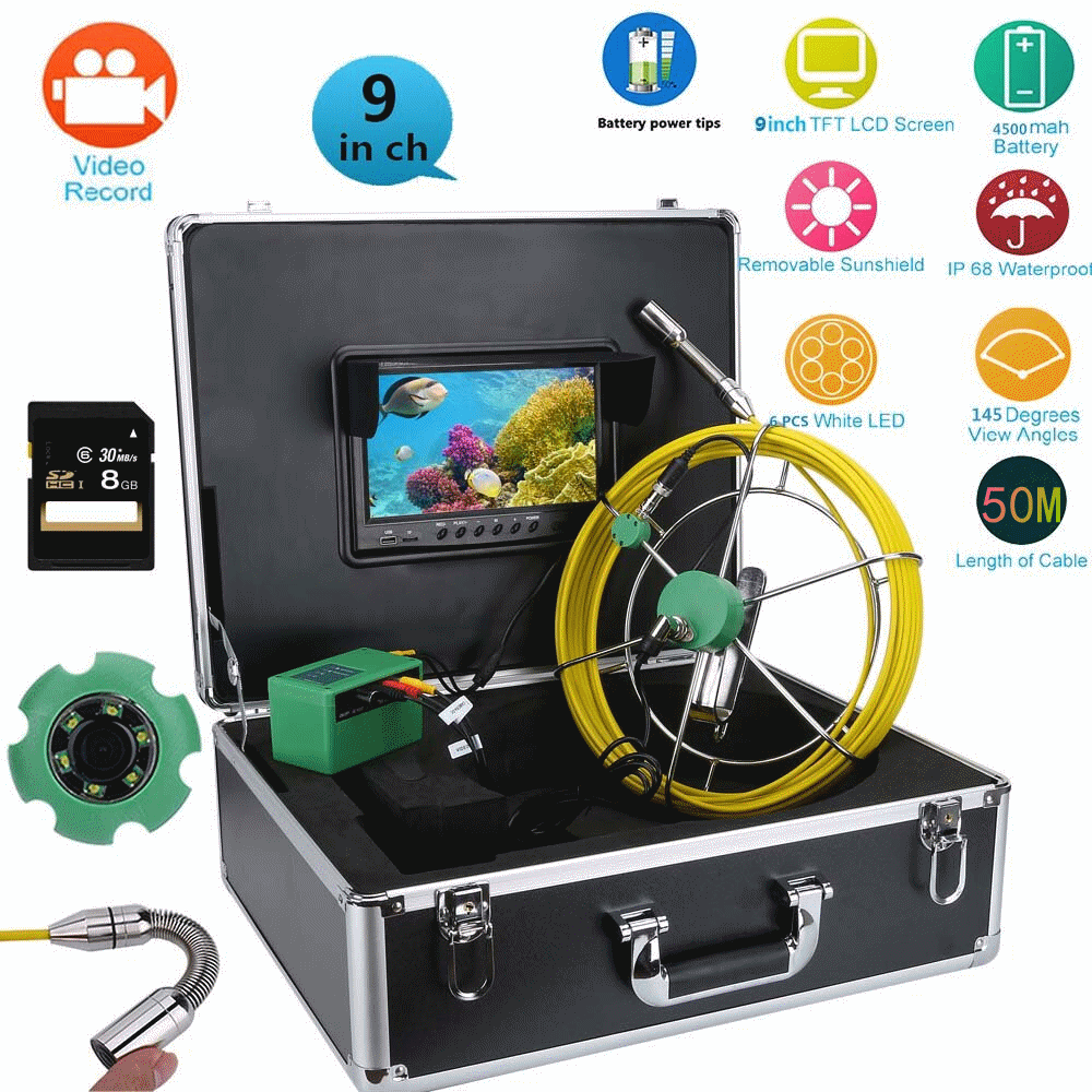 型号:F9300D-50M 配置:9寸屏录像屏送8G卡,,直径22mm探头,高清1000线 ,镜头角度145度,50米管道内窥镜,4500MA内置电池,带电量显示,灯亮度可调,保护套38MM,补光灯6颗6W距阵白光,线直径5MM,电池续航约8小时。