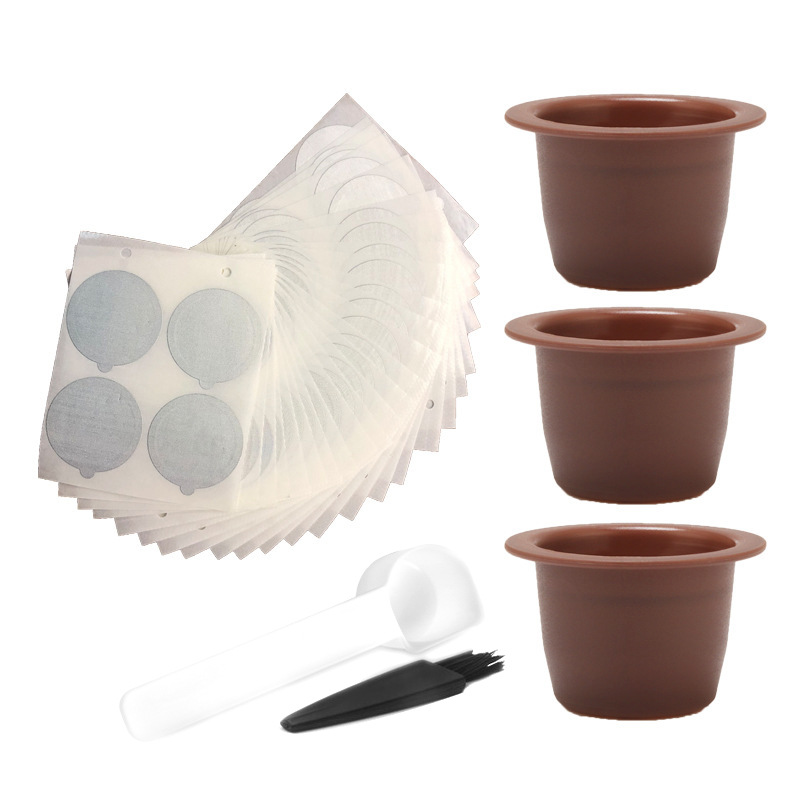 此款为半重复使用雀巢NESPRESSO胶囊,搭配一次性铝箔盖使用,结构跟原装胶囊相似,咖啡效果更佳。(杯身为可重复用,铝箔为一次性用)