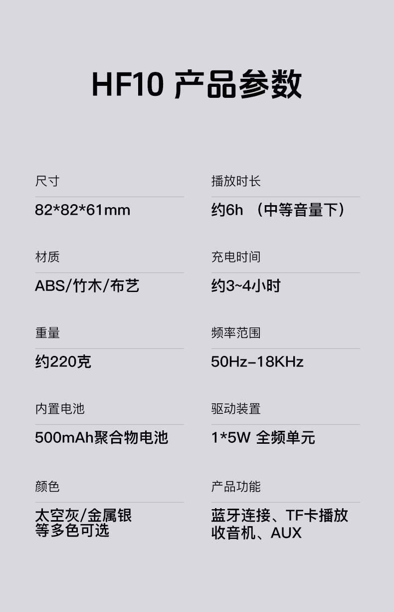产品功能:TWS对联/ TF卡播放/FM收音机/蓝牙通话/手提