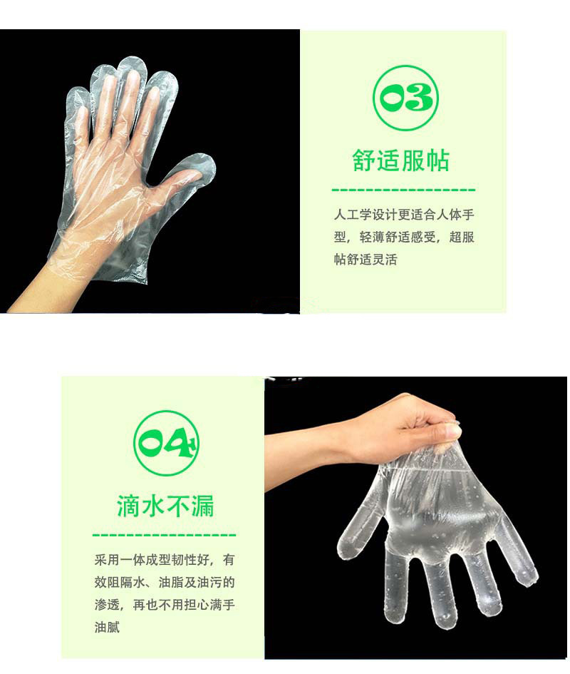 【商品特点】:一次性PE卫生手套,采用食品级无毒无味聚乙烯材料精制而成。