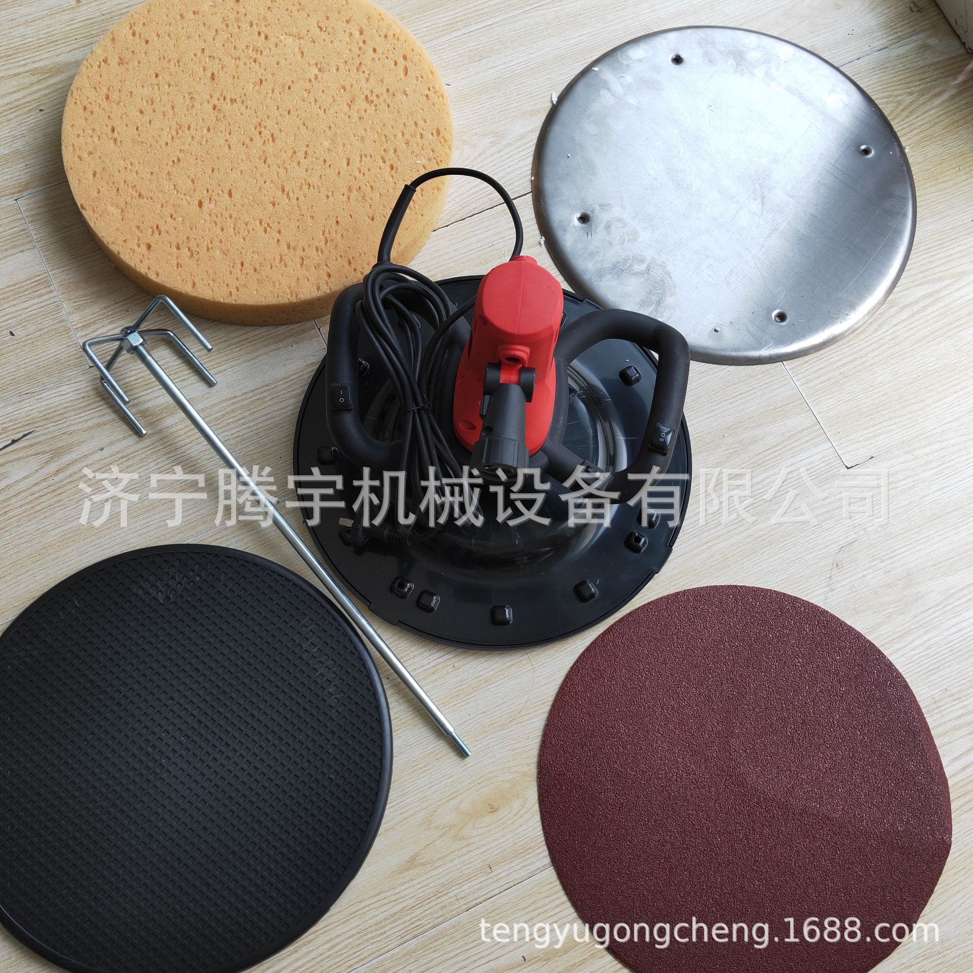 4.机械本身自带塑料盘用于粗砂浆收光,海绵磨盘用于细砂浆收光,配带2张砂纸用于打磨墙面机械,自带3米电源线完全做到一机多用