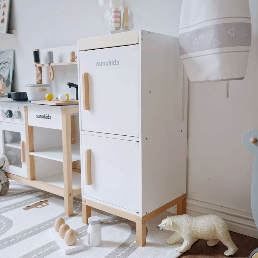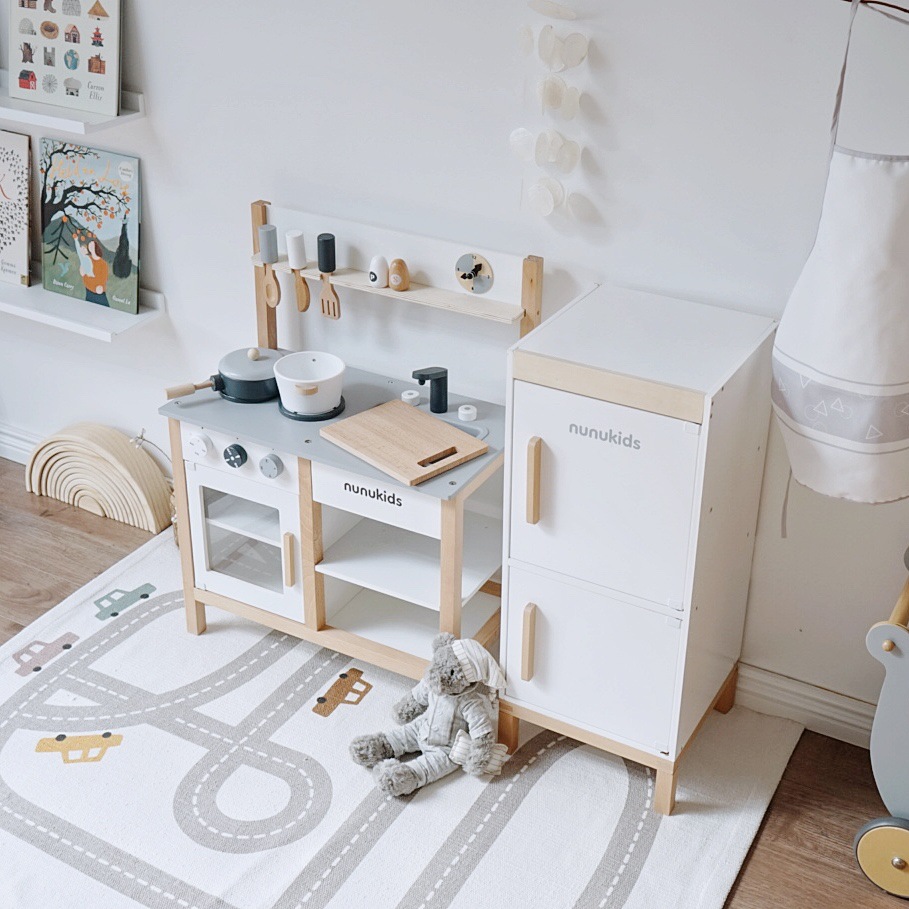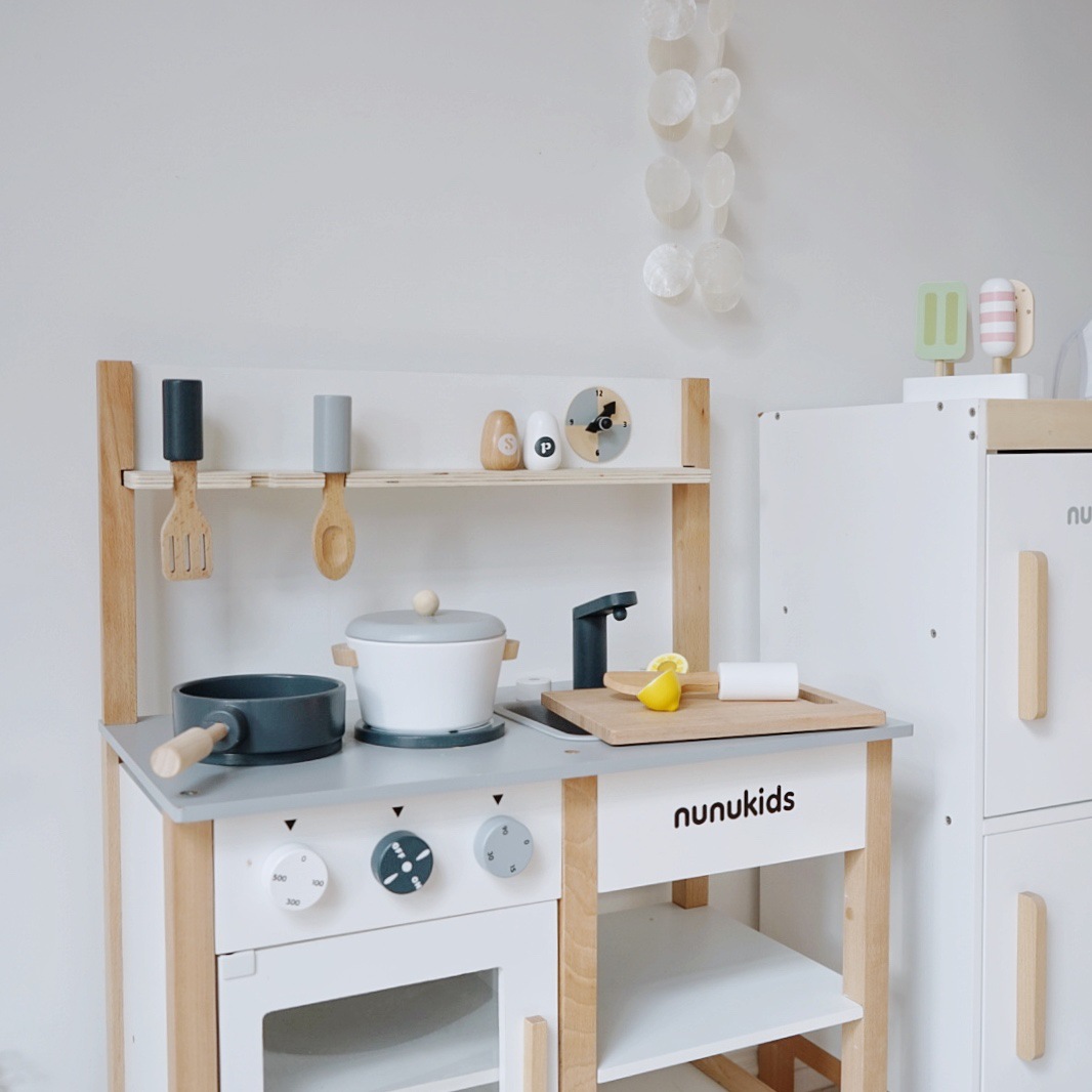 nunukids出口北欧,北欧风厨房过家家玩具。产品尺寸:55*30*73cm。操作台面高46cm