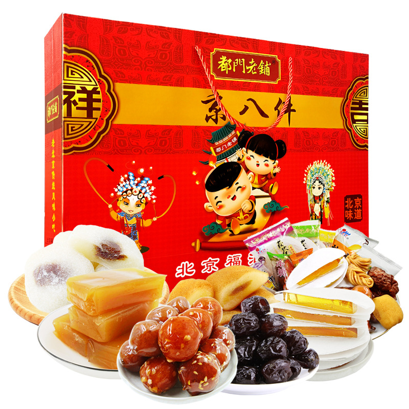 内装产品说明: 每提从冰糖葫芦、茯苓夹饼、香酥麻花、阿胶枣脯、驴打滚、艾窝窝、豌豆黄、蜜枣脯、牛皮糖、羊羹等十种小吃中随机组合装8种不重复的小吃,因品种较多,主图及页面图片仅为展示包装,每批次内装产品默认随机,介意的亲勿拍,如需固定内装产品请联系在线客服。