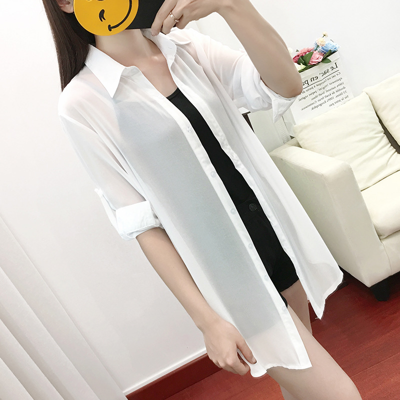 한국식 쉬폰 긴팔 셔츠 여성용 얇은 루즈한 여름 모든 경기 투시 유럽과 미국의 중간 길이 선크림 가디건 탑스토어 가기