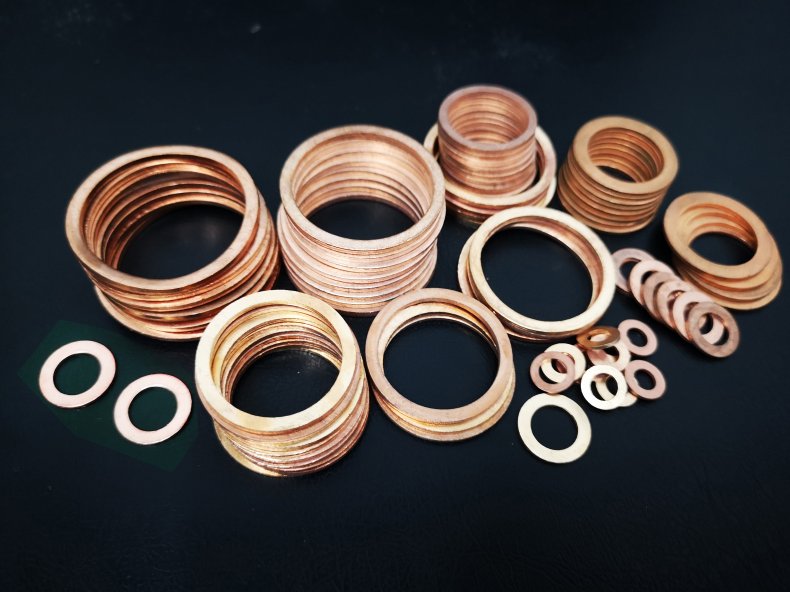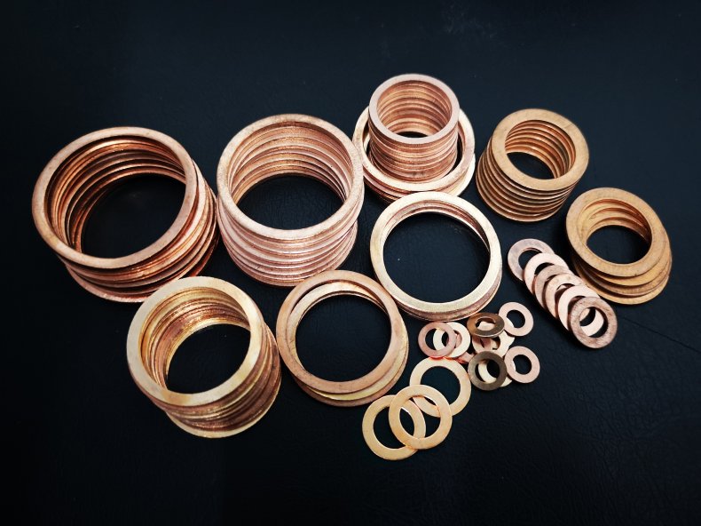 “紫铜”因为其柔软耐压力,耐溶剂,是优良的密封材料,广泛用于高压力流体接头和溶剂管道的密封。油底壳放油孔和放油螺丝(螺塞)之间的密封材料就采用了紫铜垫片。本公司(紧固件厂)采用优质纯紫铜冲压制成,经高温退火。垫片颜色发暗是经过退火处理(并经酸洗颜色比较一致)以消除原材料的内部应力,取得更好的塑性,从而达到优良的密封性能。