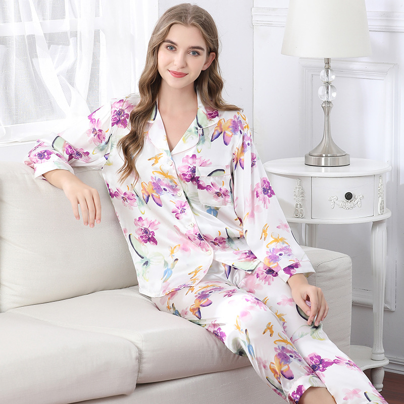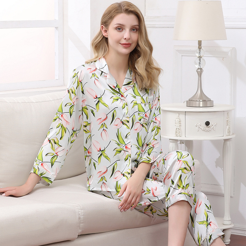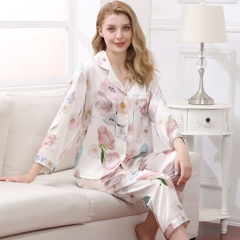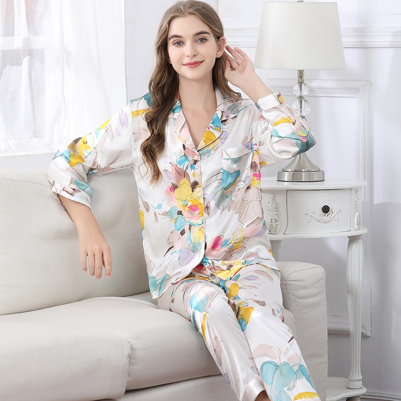 도매 무거운 실크 잠옷 여자의 100 뽕나무 실크 봄과 가을 플러스 사이즈 투피스 세트 긴 소매 실크 가정복스토어 가기