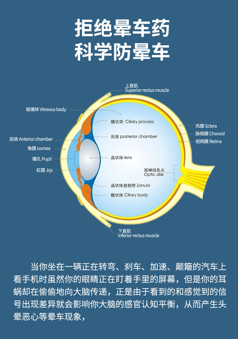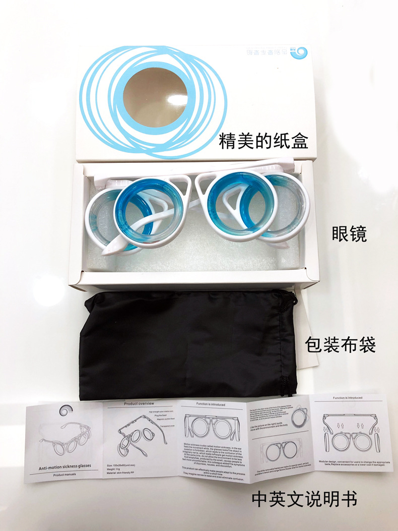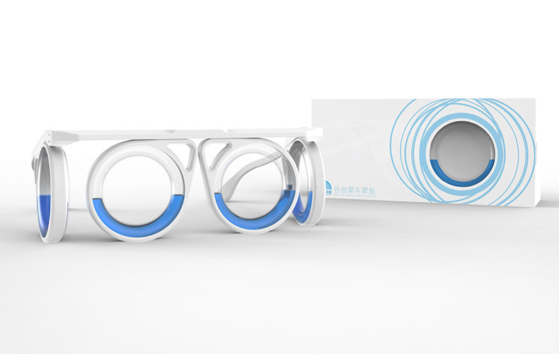 晕车是我们正常的生理反应,有些长期晕车的人甚至对汽车产生了恐惧,一上车就晕的不知西北了。但大多数人还是只有轻微的晕车感。这是一个非常巧妙地设备,它能够在眼睛和大脑之间创造一种平衡,这样你的大脑就不会感觉到不和谐了。它在正面和左右两侧共有四个圆形镜框,每个镜框中装有高度为镜框一半的蓝色液体 ,这些蓝色液体的作用是在交通工具出现摇晃或倾斜时,让使用者始终能在视线范围内看到正确的水平线,以此来修正视觉的感知。同时我们的眼镜还会散发柠檬果味哦,就是这么简单的原理,但是对交通晕车都非常有效。该眼镜不需要一直佩戴,在眩晕出现后十分钟左右带上就行了,不管你是晕车晕船还是晕飞机,这个小小的眼镜都适用,你终于可以告别副作用极大的晕车药了。