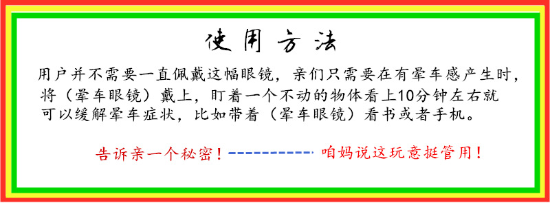 佩戴步骤:①出现个晕车症状后立即装备自己(可戴在一副眼镜上)。