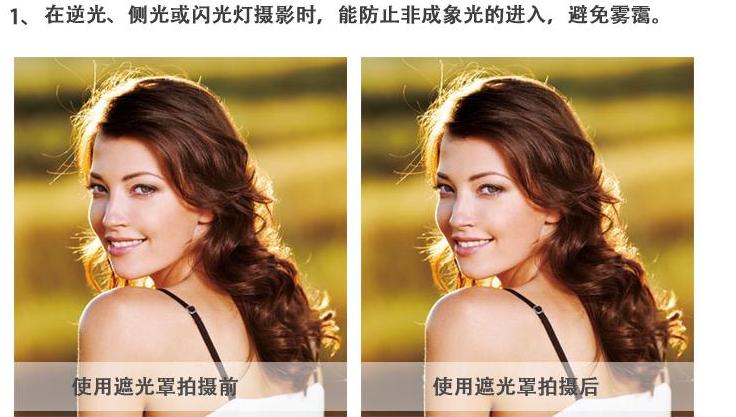 1.在逆光、侧光或闪光灯摄影时,能防止非成象光的进入,避免雾霭。
