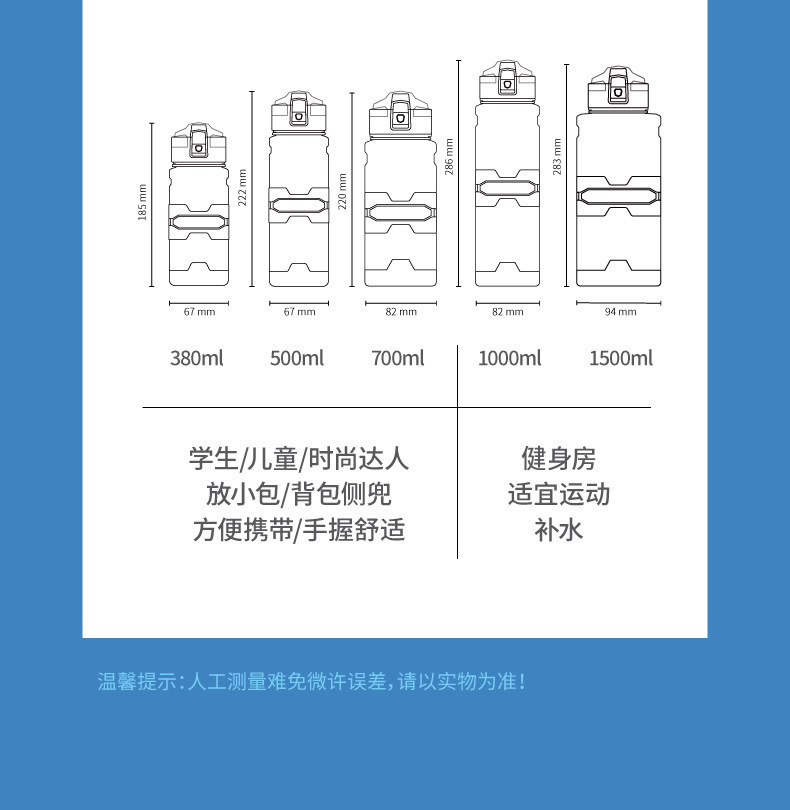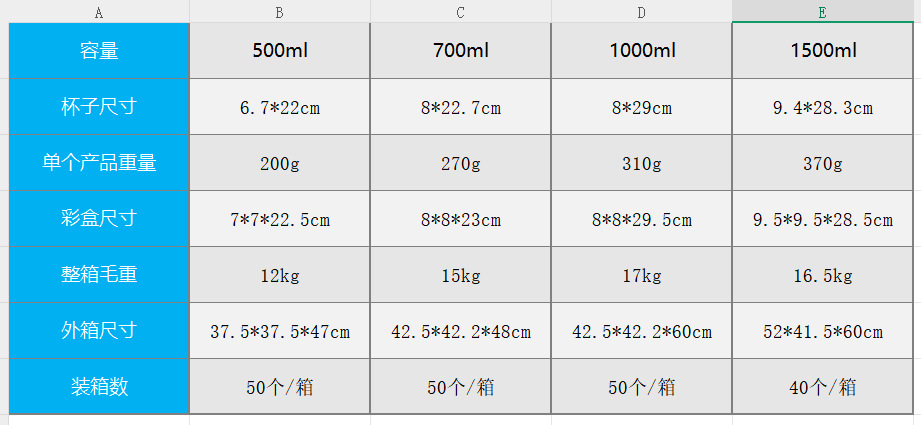 透明款的(500 700 1000 1500毫升四个规格) 彩盒都是如下 绿色这个盒子