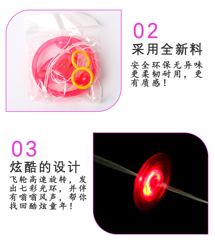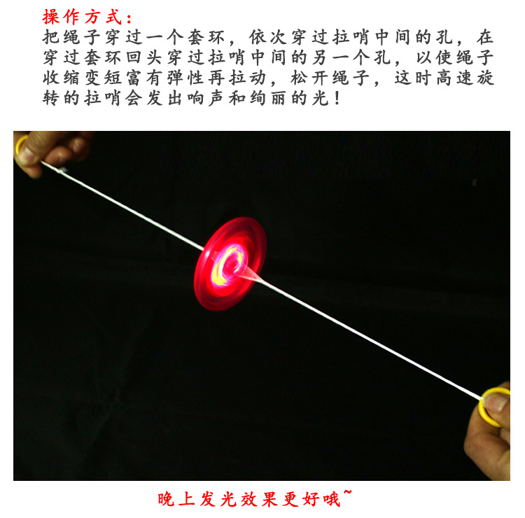 宝贝说明: 拉绳玩具,通过拉动,飞轮高速旋转,发出七彩光环,并伴有响亮的哨声,夜间效果更好!!! 把绳子一头系在1个套环上后,依次穿过拉哨中间的1个孔、另1个套环,再回头穿过拉哨中间另1个孔,后跟第1个套环连接起来。拉前要先用两手甩动拉哨,以使绳子收缩变短富有弹性,再拉动、松开绳子,这时高速旋转的拉哨会发出响声。