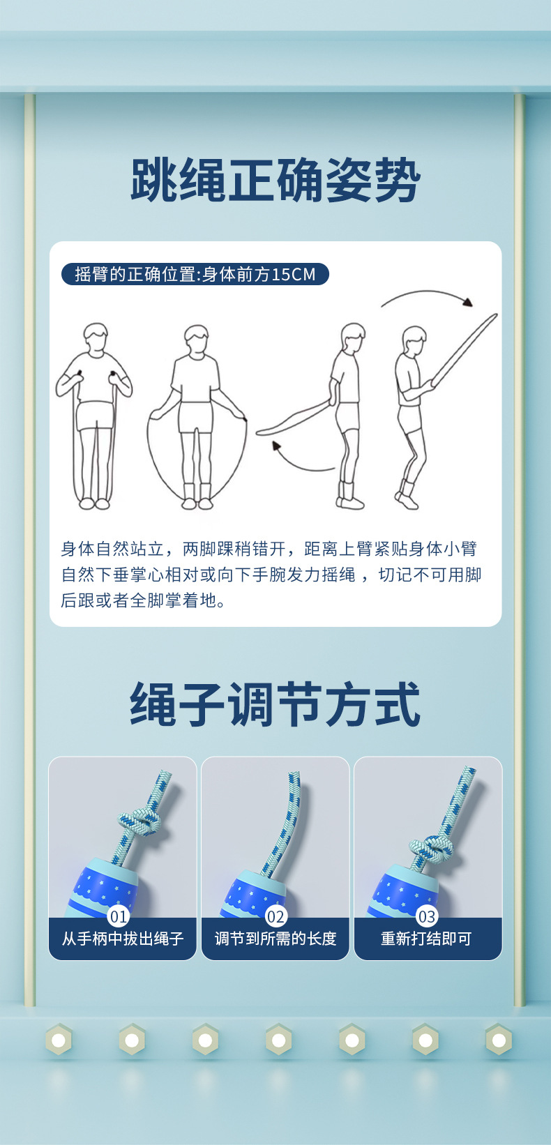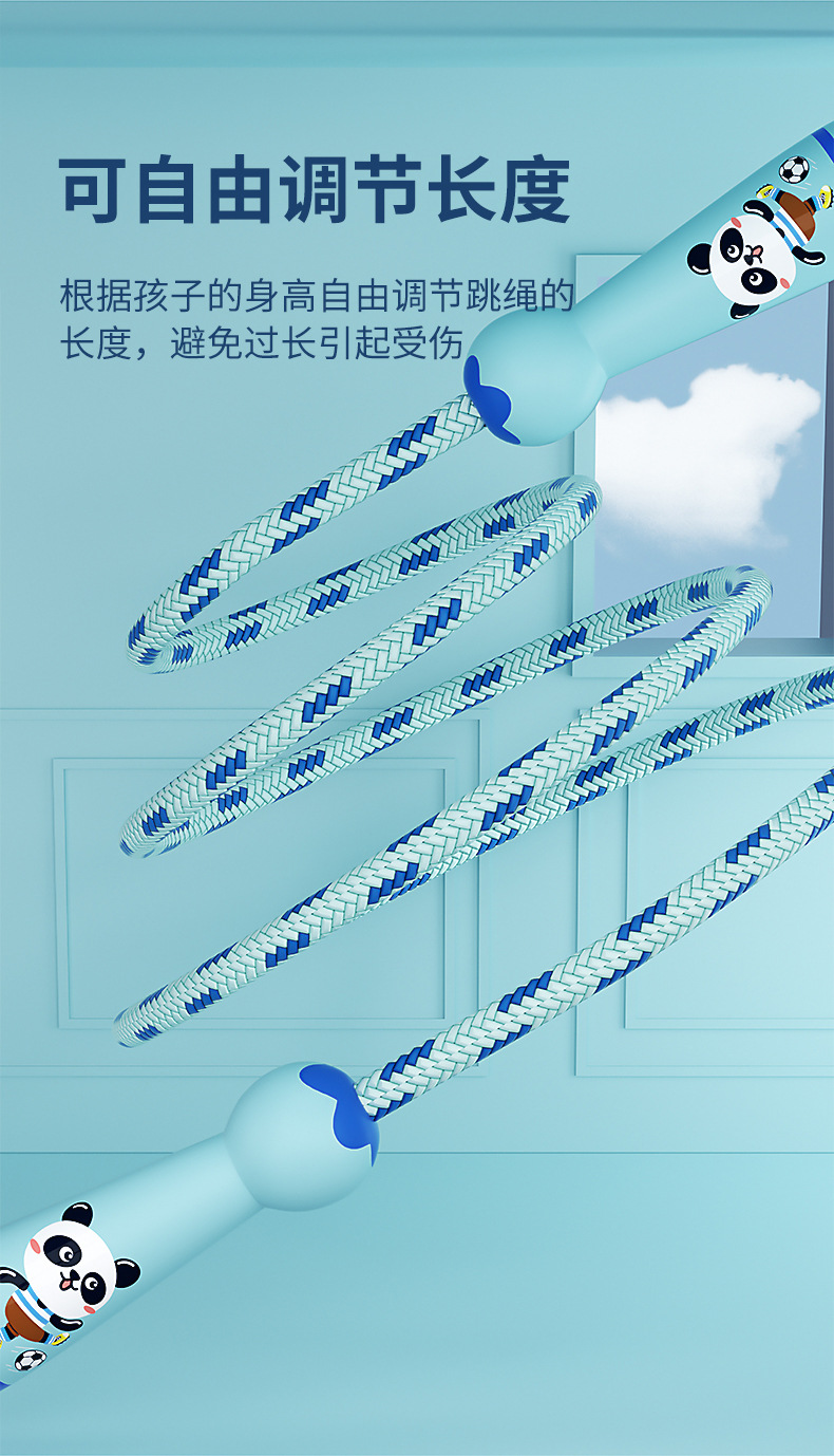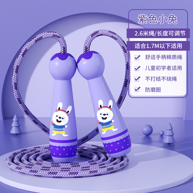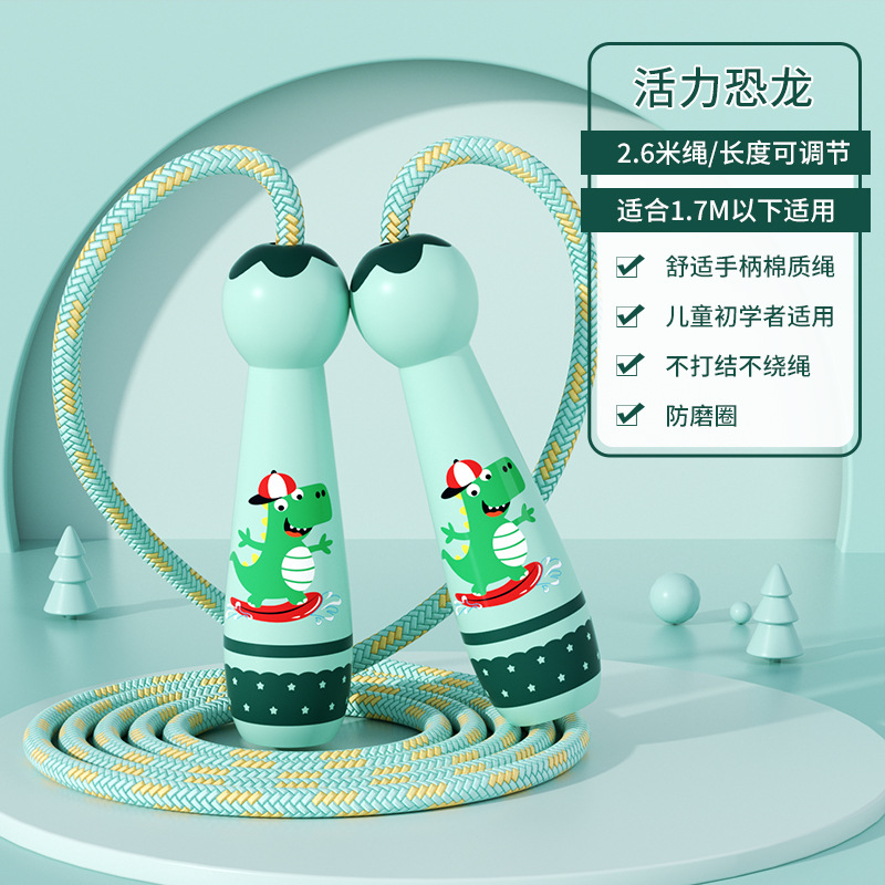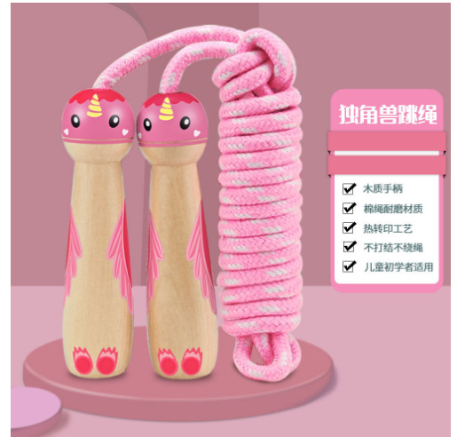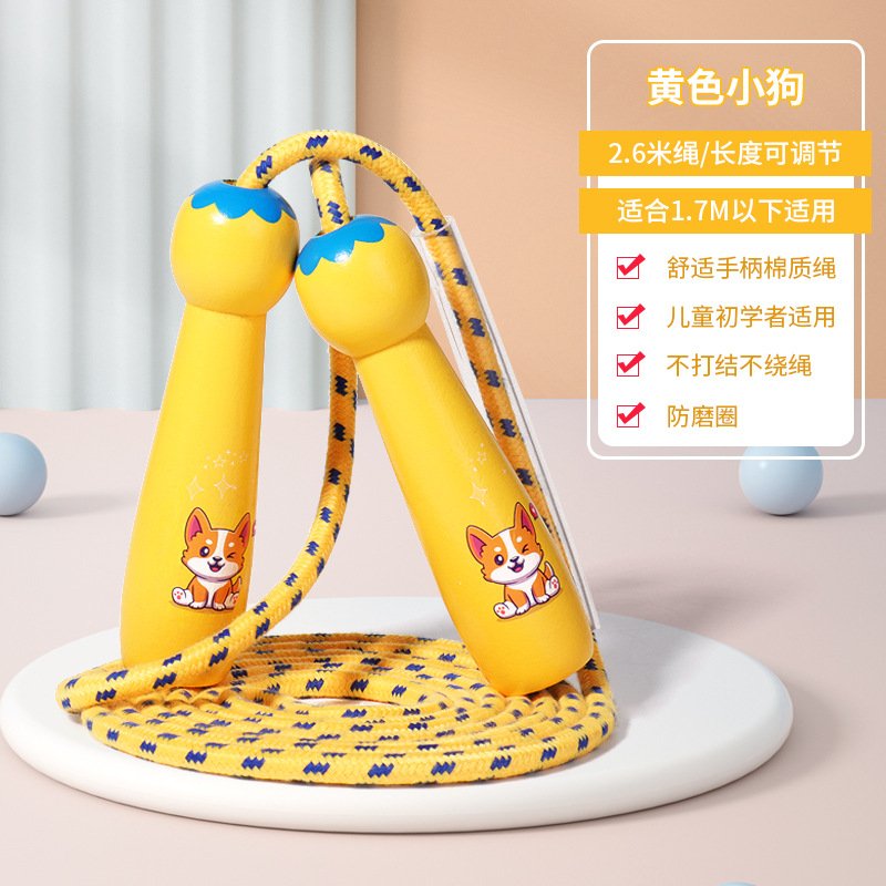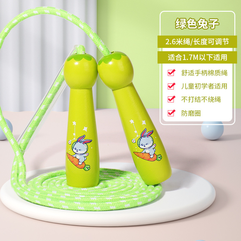 儿童跳绳:可调节跳绳 材质:木质手柄+棉绳 绳长:260cm绳宽:0.6cm 手柄长度:12cm 产品重量:128g