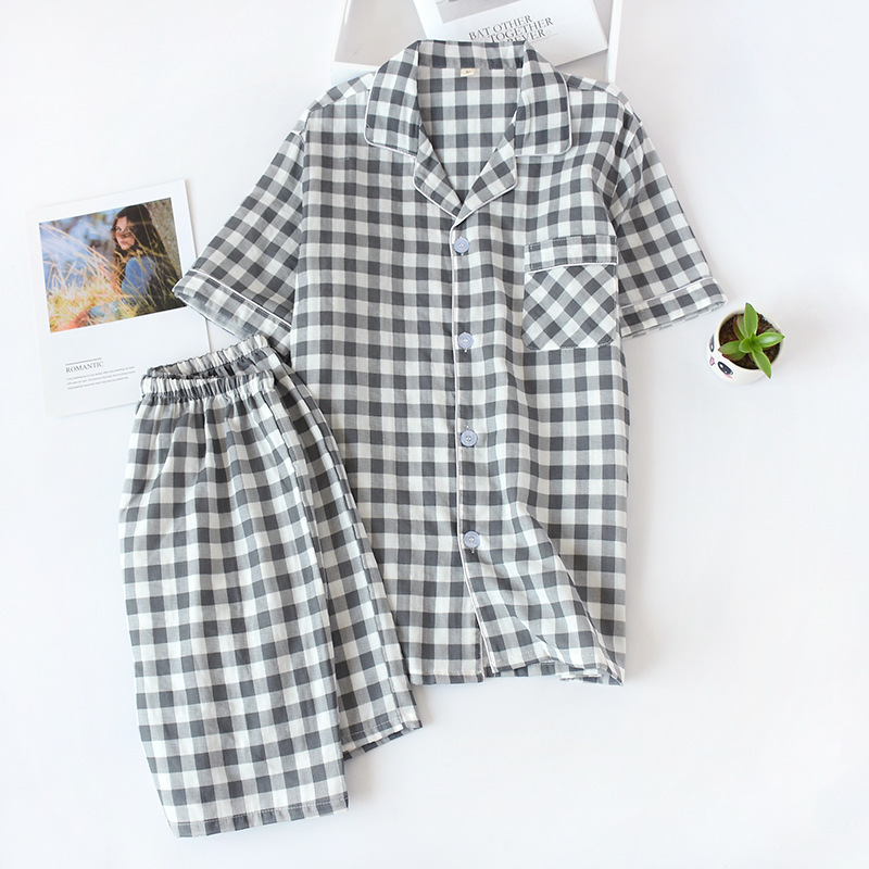 여름 반팔 바지 여성용 더블 레이어 거즈 홈 의류 커플 격자 무늬 얇은 생활 땀 흡수 통기성 잠옷 세트스토어 가기