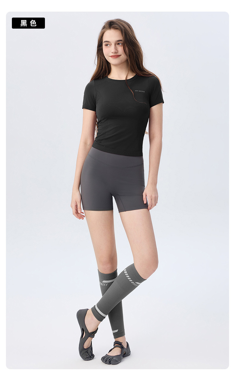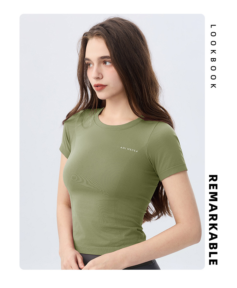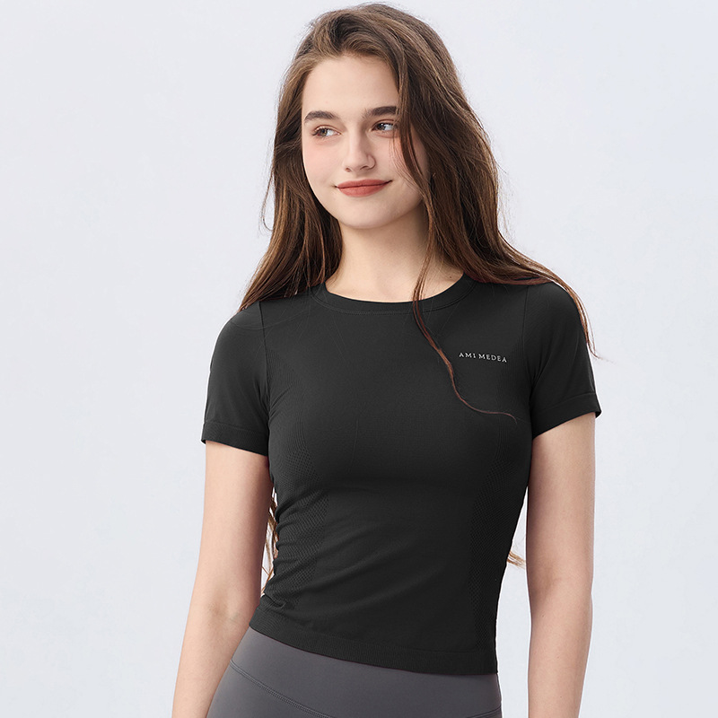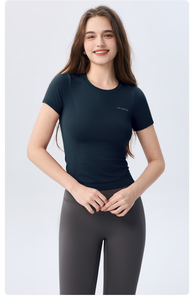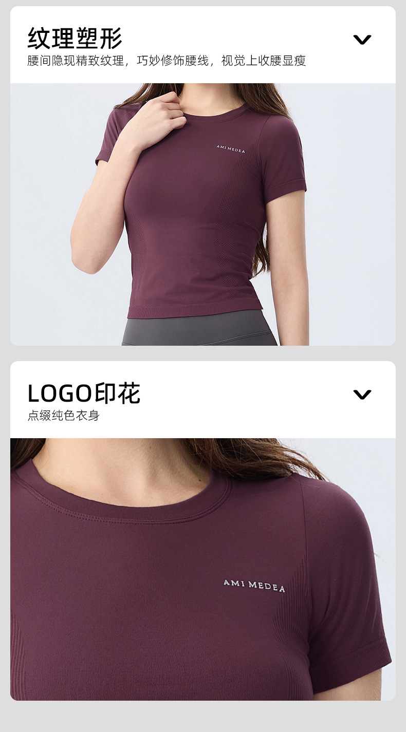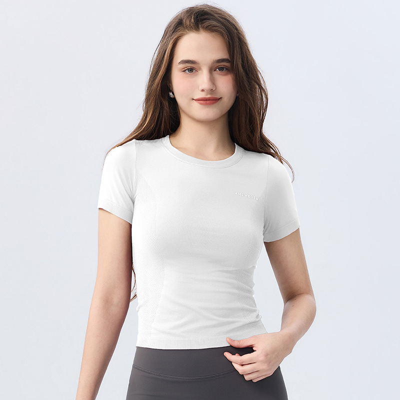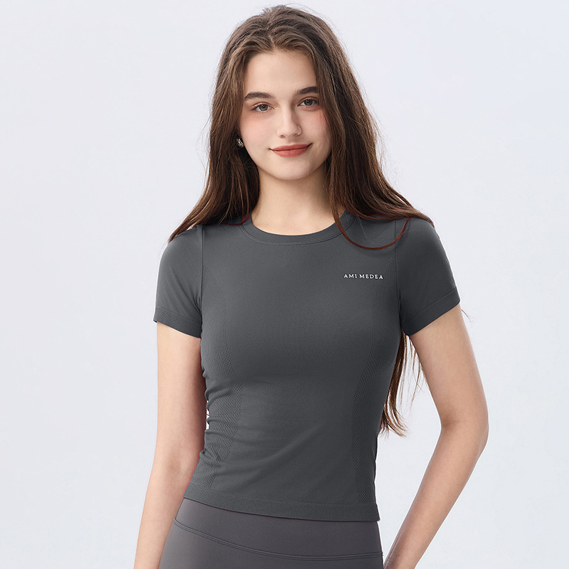 AMI MEDEA 스포츠 반팔 꽉 끼는 달리기 원활한 피트니스 세트 티셔츠 짧은 단색 요가 세트 여성 탑스토어 가기