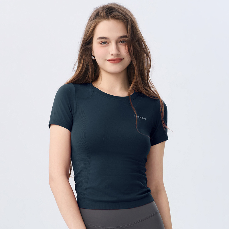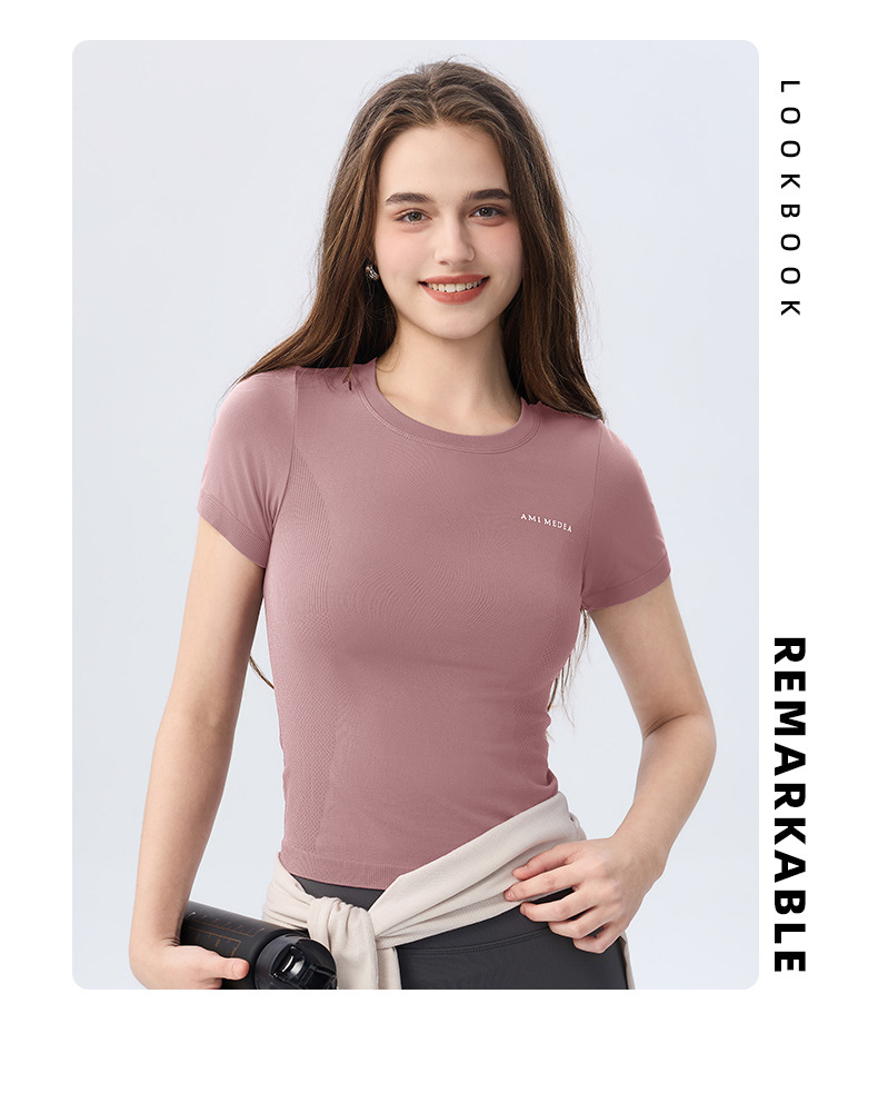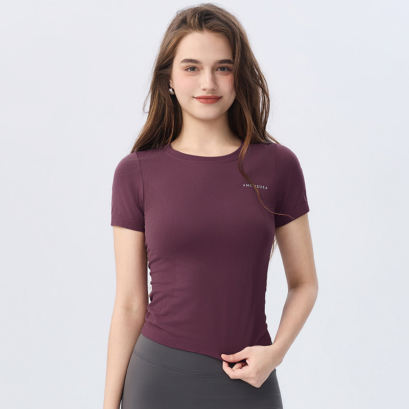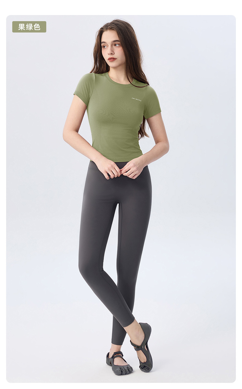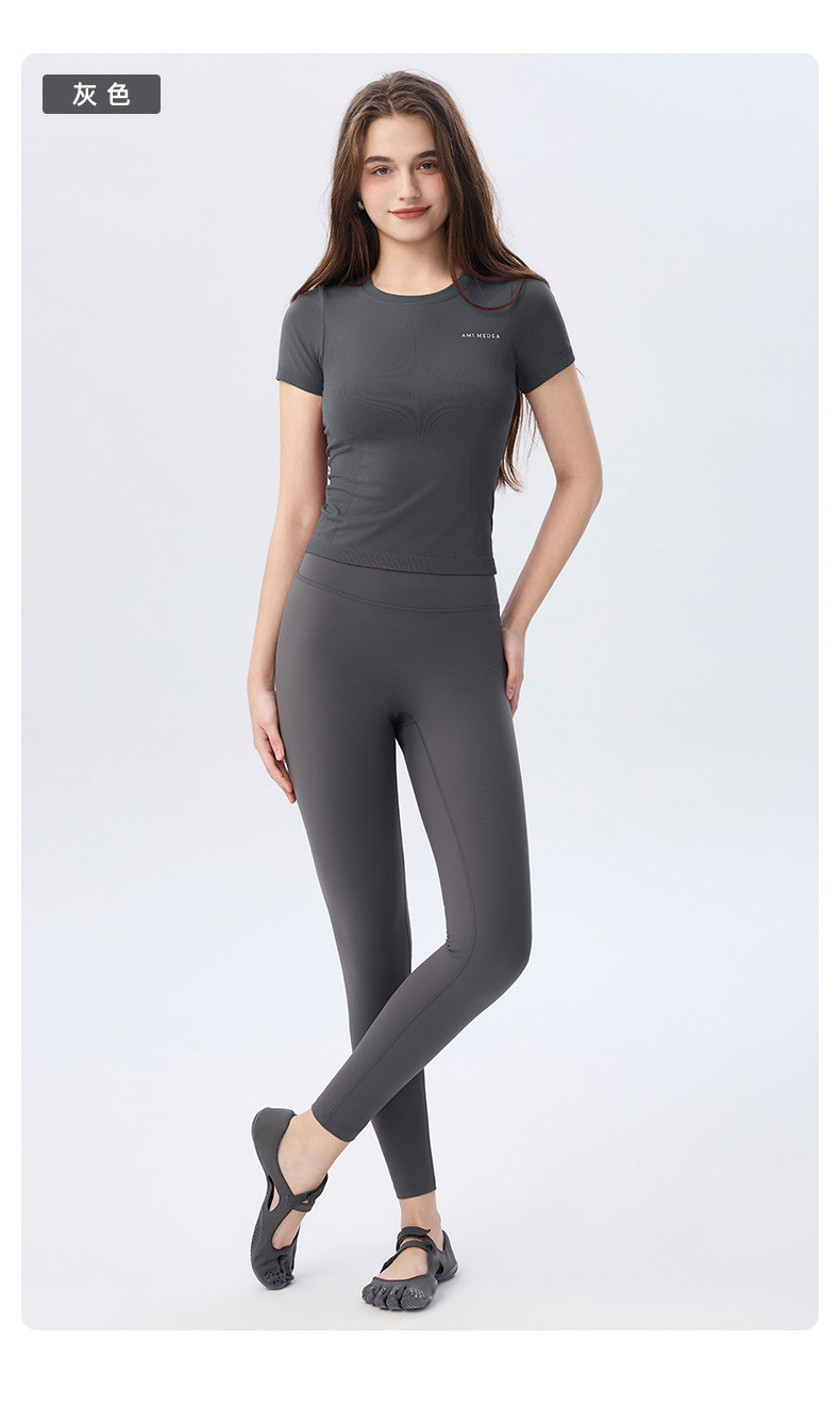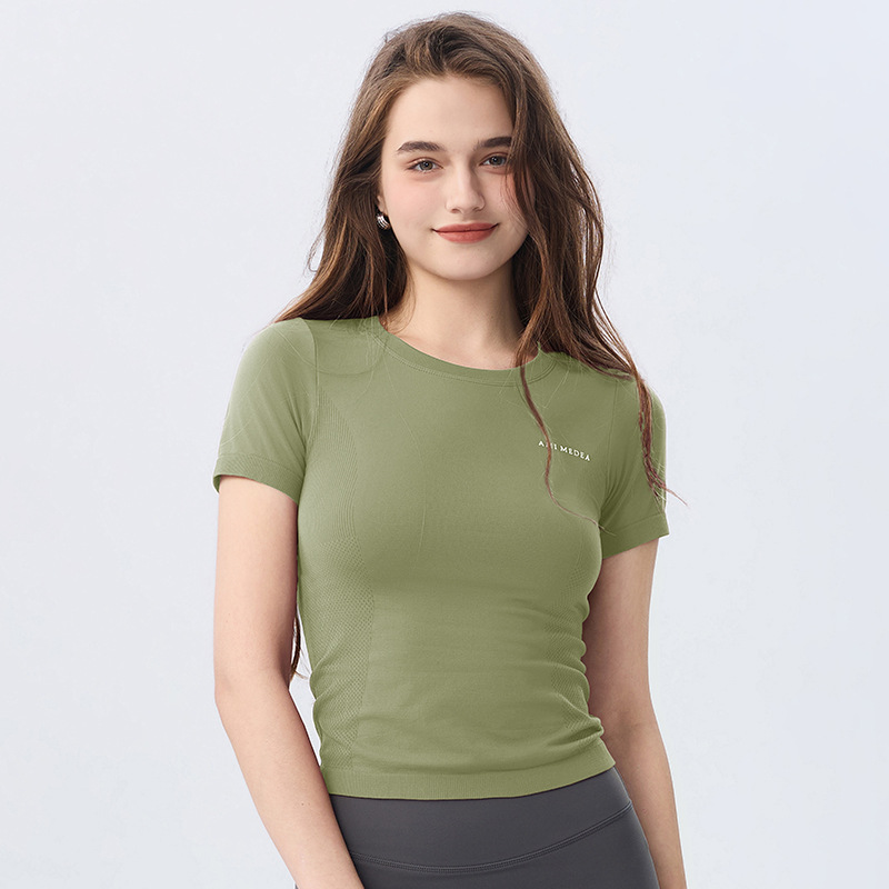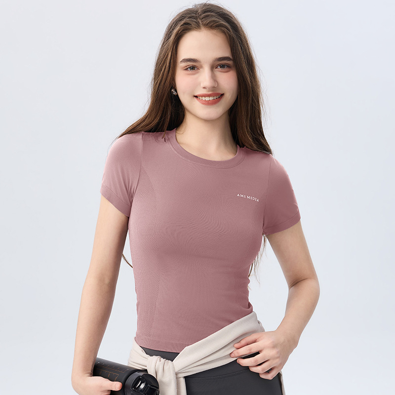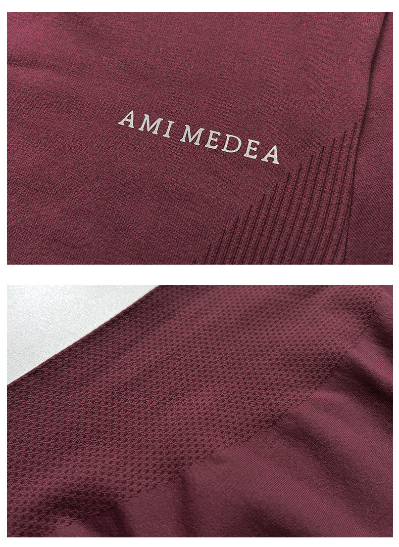AMI MEDEA 스포츠 반팔 꽉 끼는 달리기 원활한 피트니스 세트 티셔츠 짧은 단색 요가 세트 여성 탑스토어 가기