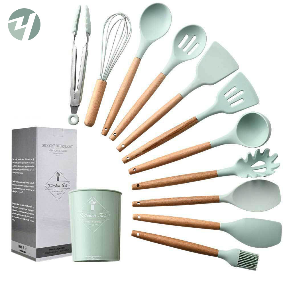 나무 손잡이가있는 아쿠아 그린 저장 배럴 실리콘 주방 용품 11 종 세트 붙지 않는 삽 주방 용품 요리 세트스토어 가기