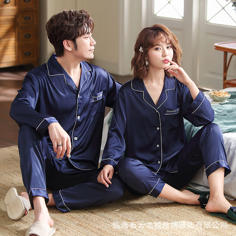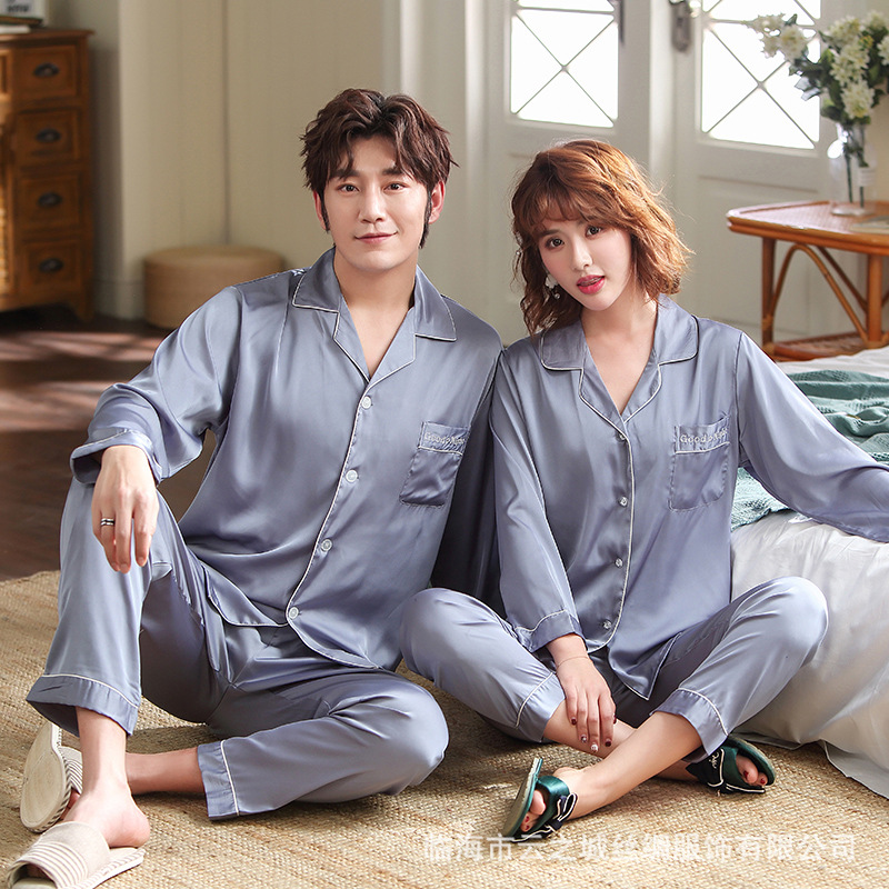 가을 새로운 실크 아이스 실크 카디건 커플 잠옷 새틴 쉬폰 캐주얼 간단한 가정 옷 투피스 세트스토어 가기