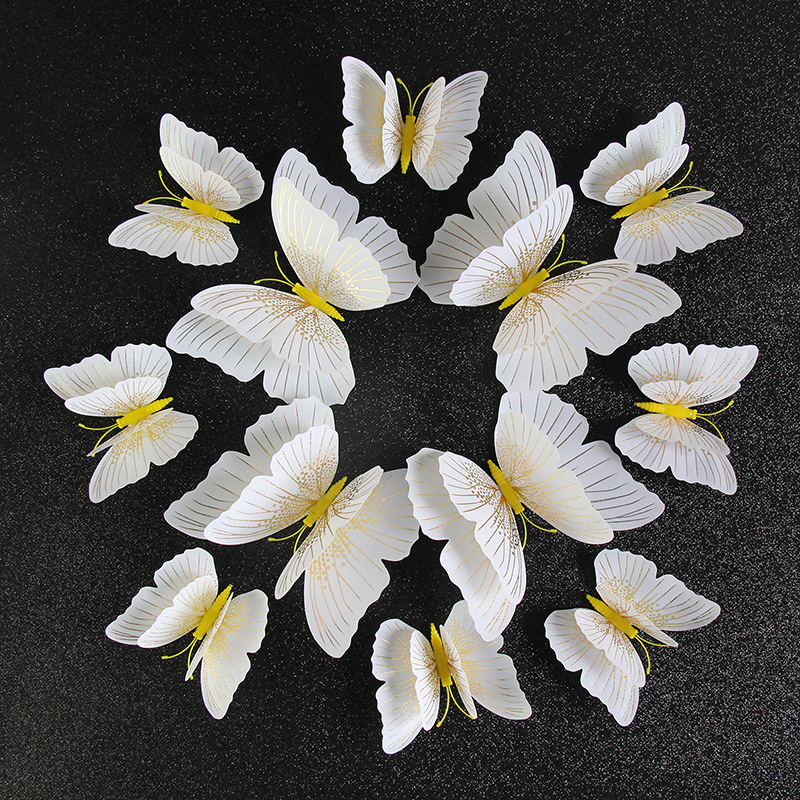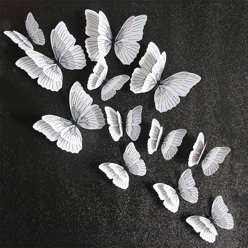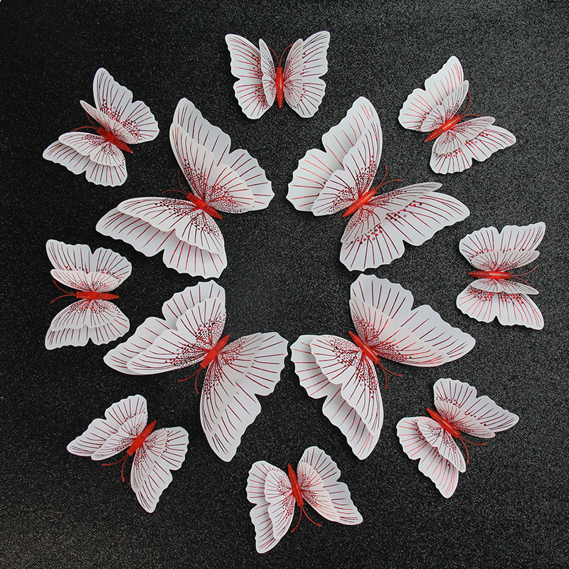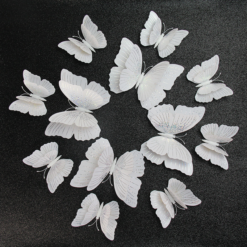 闪光3d立体蝴蝶PVC墙面装饰工艺品配件流光溢彩双层套装厂家直销,双层3D立体仿真蝴蝶 客厅墙贴冰箱磁性贴商场装饰幼儿园教室布置. 尺寸:8cm双层8只,12cm双层4只。一套为一个色系。 包装:12只装一个袋子。50套装一中包。 说明:蝴蝶包装出货是平的,您可以折叠蝴蝶的翅膀, 形成您想要的蝴蝶翅膀角度。厂家直销冰箱贴 仿真蝴蝶冰箱贴 3D装饰立体墙贴12只套。 1.磁性式:可以吸住带磁性的物品,如冰箱门、铁栏杆等 2.+粘胶:可以黏贴在任何想装饰的地方。