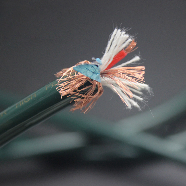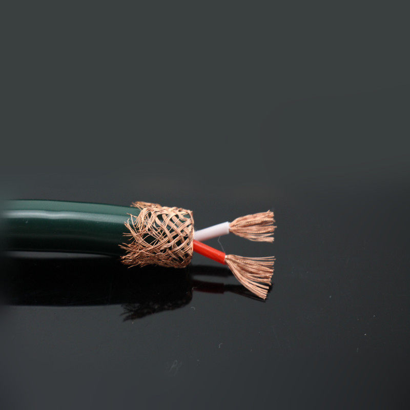 导体构成:选用高純度大晶體無氧銅导体规格为: 0.30mm+螺旋缠绕4支+高纯度屏蔽网+空隙处填充(白色纯棉线)后用(SHIELDED)紧密包裹,编织紧密屏蔽层,护套外墨绿色PVC。