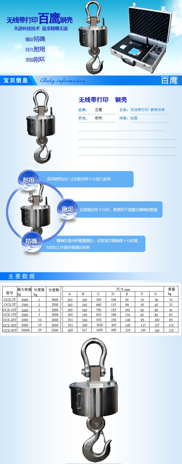 百鹰OCS-10t无线打印吊秤30吨钢壳耐用型吊钩称无线传输电子吊秤