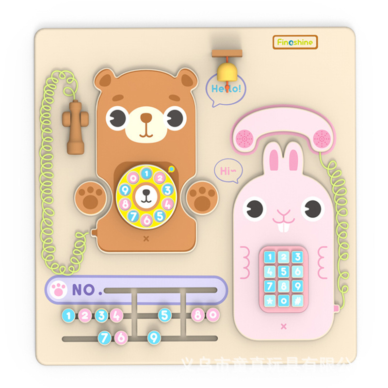 玩法:1.左侧为复古转盘式电话,小朋友可按照自己知道的号码的顺序拨动转盘对准右上角指针来模拟拨打电话;右侧为现代座机电话,按钮部分做立体突起式按钮,可让小朋友有更直观的感受。 2.右上角的小摇铃,为模拟电话打通时的提示铃音。 3.左下角的数字可让小朋友自己排列出知道的数字。