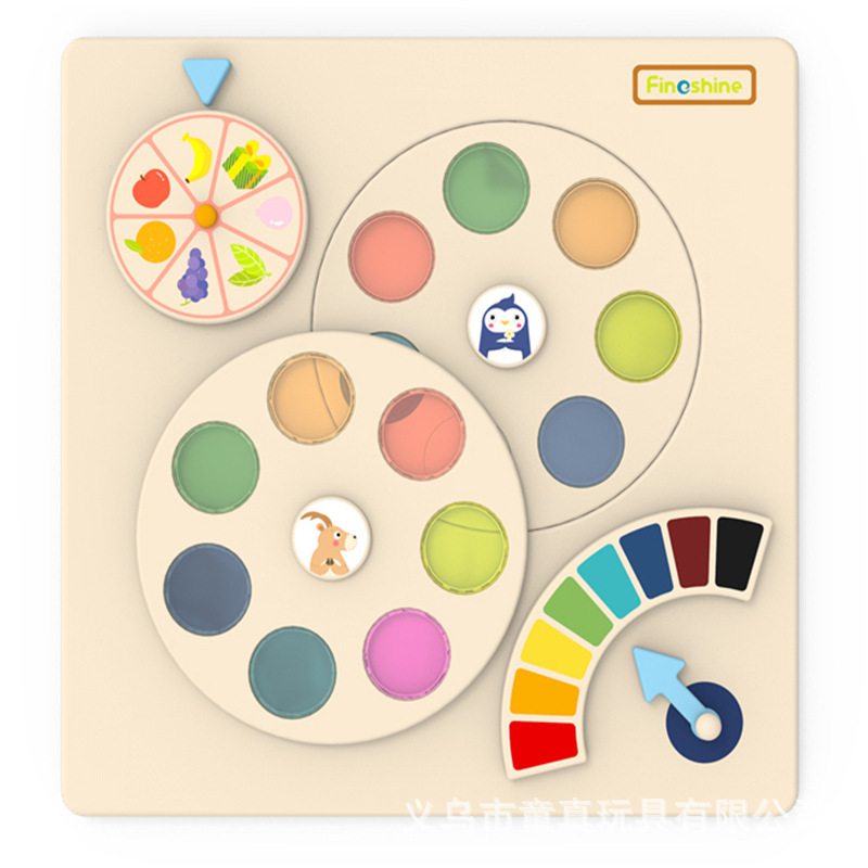 玩法:1.小朋友转动左上角的转盘得到一个物体,再将右下角的指针拨向相对应的颜色。 2.中间的两个转盘上分别嵌了七色亚克力片转盘,通过上下亮色重叠调试出与指针和物体接近的颜色,锻炼小朋友的观察力。