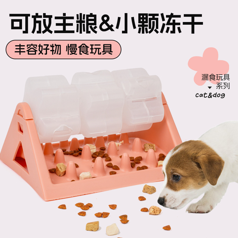 转动杯子让杯子里的粮食掉下来促进宠物对杯子转动的乐趣 底部搭配慢食盆使得宠物不会狼吞虎咽的很快吃完这样可以防止宠物肥胖。宠物独处的时候既不用担心无聊而闷闷不乐,也不用担心食物填加得不及时而饿着。产品低盘材料是硅胶软材质的,宠物吃食的时候不会伤到嘴巴,且有多数的凸起物,有效抑制宠物狼吞虎咽。家中有宠的好选择。