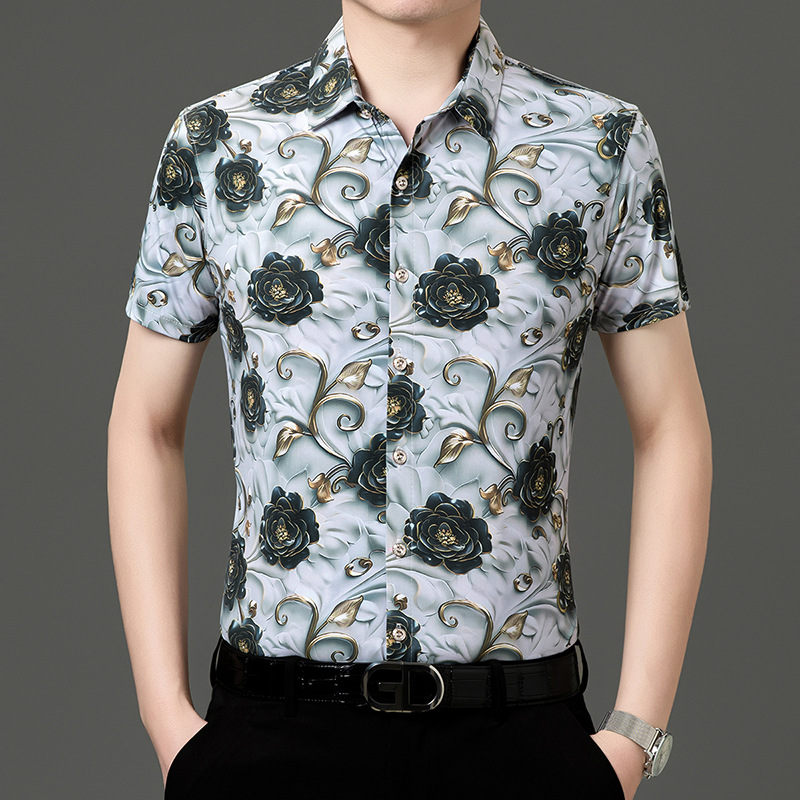 2025 새로운 반팔 셔츠 남성 캐주얼 중년 슬림 꽃 무늬 얇은 옷깃 꽃 반팔 셔츠 대외 무역