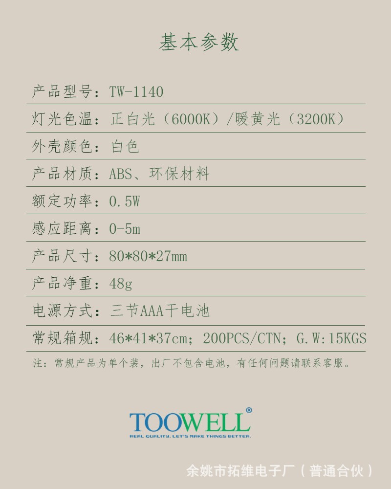 【LED数量】:2个3528 SMD贴片式6000K正白光或3200K暖光LED灯