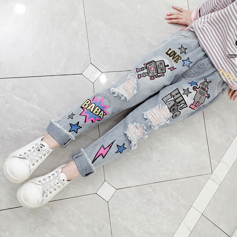 소녀 청바지 2024 새로운 봄과 가을 중 큰 어린이 구멍 그라인딩 바지 만화 인쇄 캐주얼 바지 봄스토어 가기
