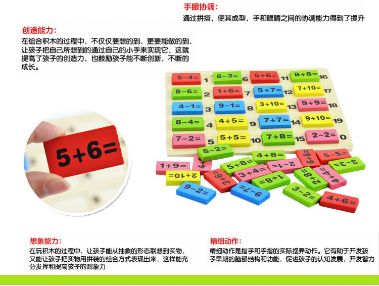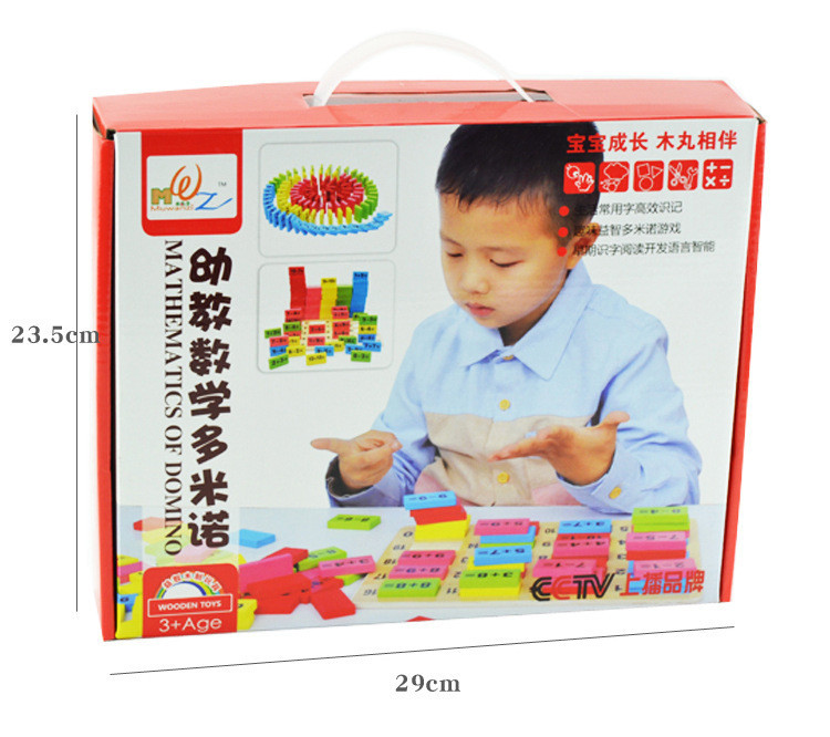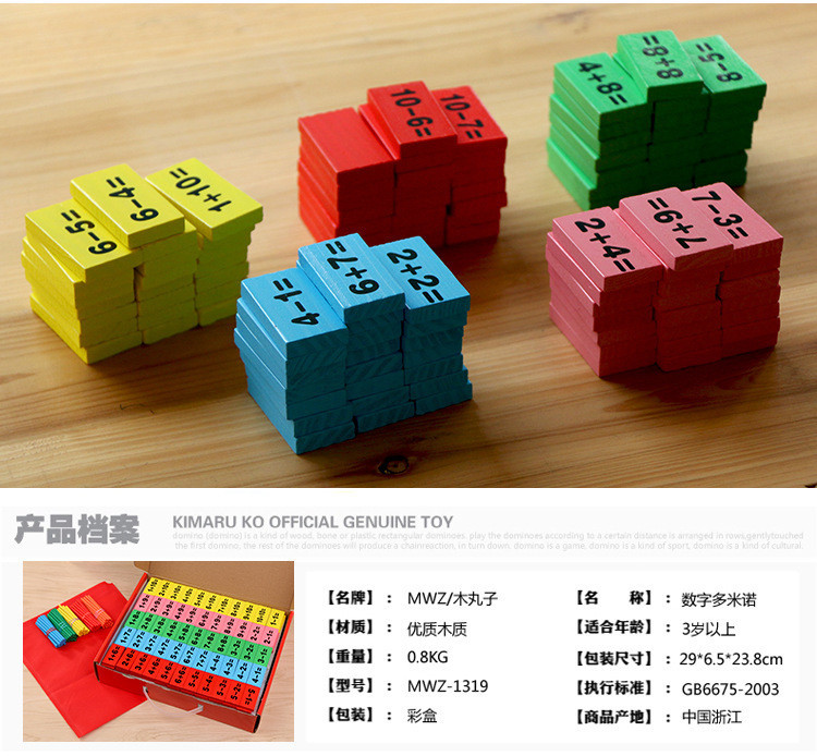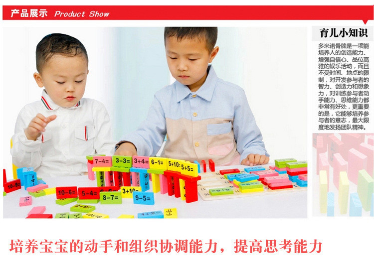 这是一款学习数学知识的多米诺,每片骨牌上都烫印有数学知识,由让孩子在玩耍的同时,不自觉地学习了很多知识,增加了见闻,确实是一款不可多得的好玩具,也是一款好教具哦,爸爸妈妈可以根据骨牌上的内容,有针对性滴灌输给宝宝各种知识,强化宝宝的记忆,相信可以在以后的学习成长中快人一步哦