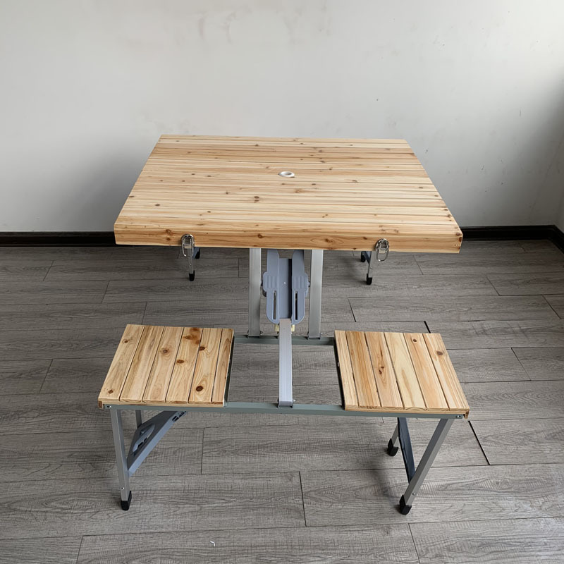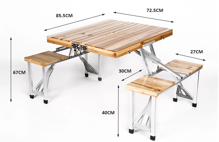 产品特点:桌面和凳面为实木材质,凳子腿为坚固的铝合金材料,可折叠收纳,易携带、放置,适合家人、朋友外出野餐,也适宜友人,下棋、打牌娱乐,收纳时可将凳子完全收纳其中,美观