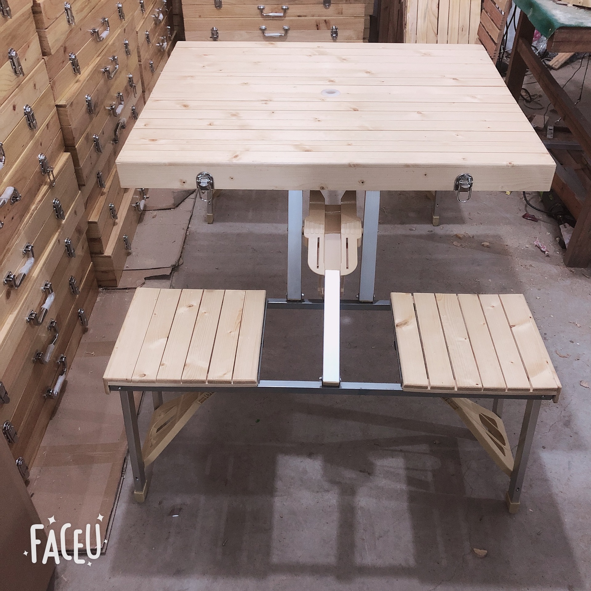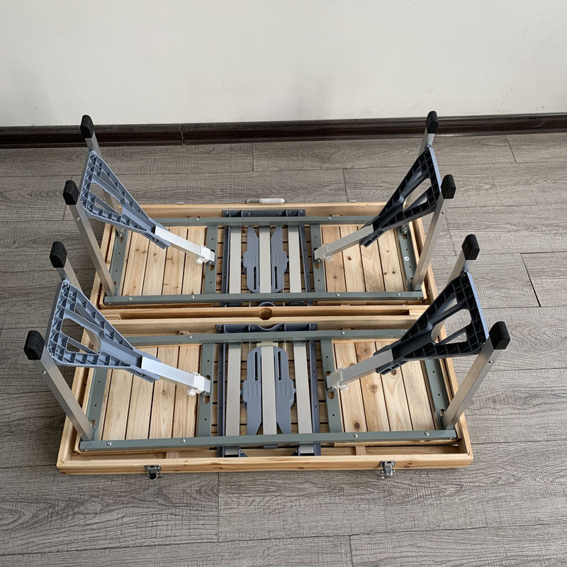 木质折叠桌椅 木制折叠野餐桌椅 实木折叠野桌烧烤桌实木连体桌椅,桌面和凳面采用的是杉木,支架由ABS塑料、铁方管采用20*20mm0.7mm规格及30*15mm0.7mm铝管组成,每个凳面承重90公斤,桌面承重25公斤,杉木桌面和凳面采用一道清底漆和清面漆进行防腐。