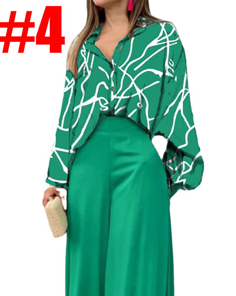 유럽과 미국 여성 크로스 보더 새로운 2023 여름 루즈한 플러스 사이즈 캐주얼 프린트 셔츠 탑 와이드 레그 팬츠 투피스 세트스토어 가기