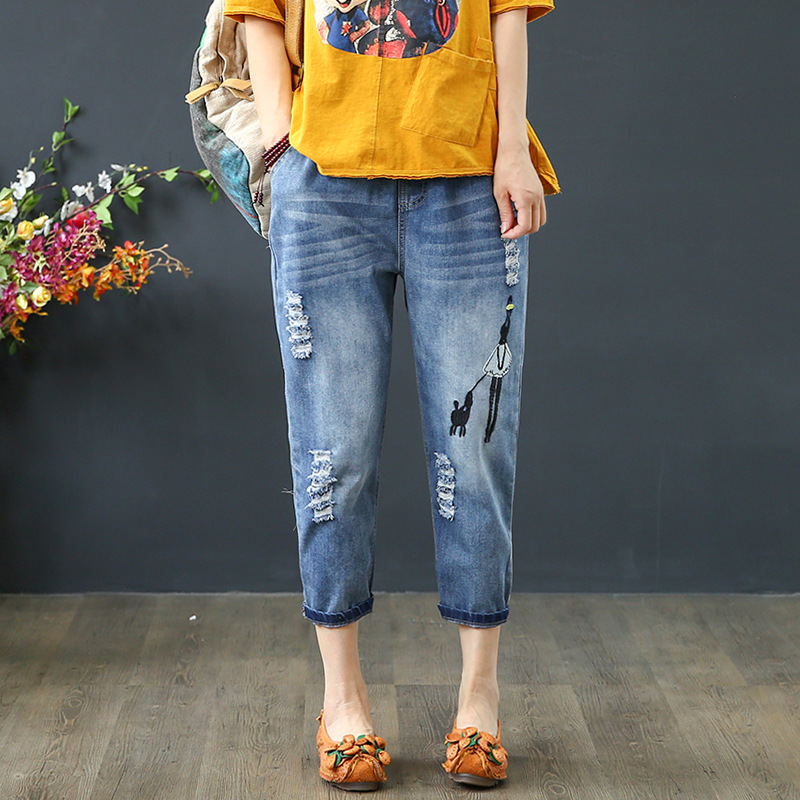 여자의 청바지 봄과 가을 찢어진 예술적 자수 여자의 자른 바지 탄성 높은 허리 플러스 사이즈 청바지 여자의 느슨한스토어 가기
