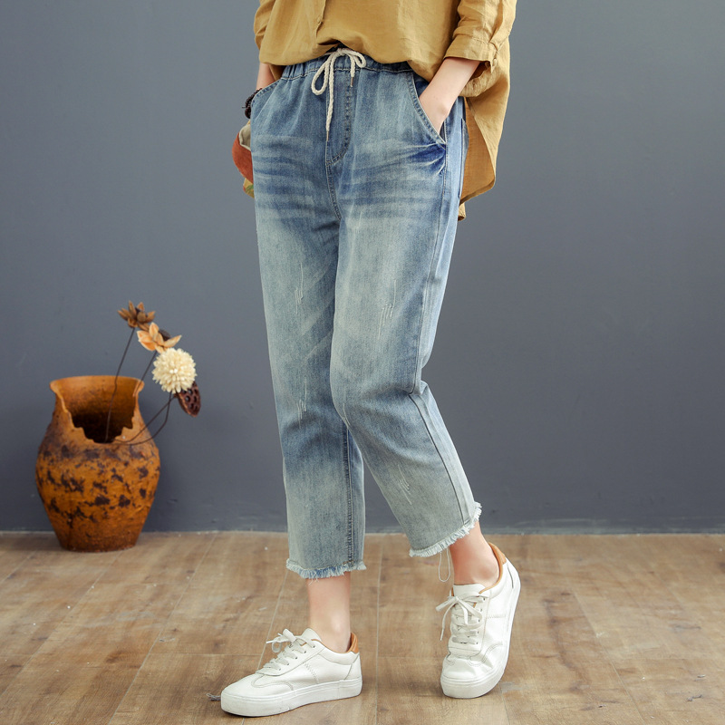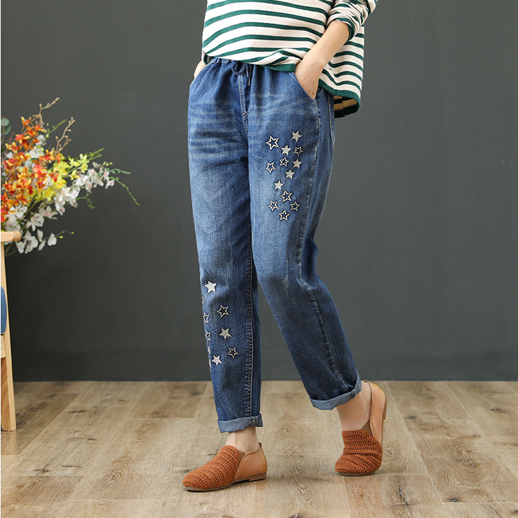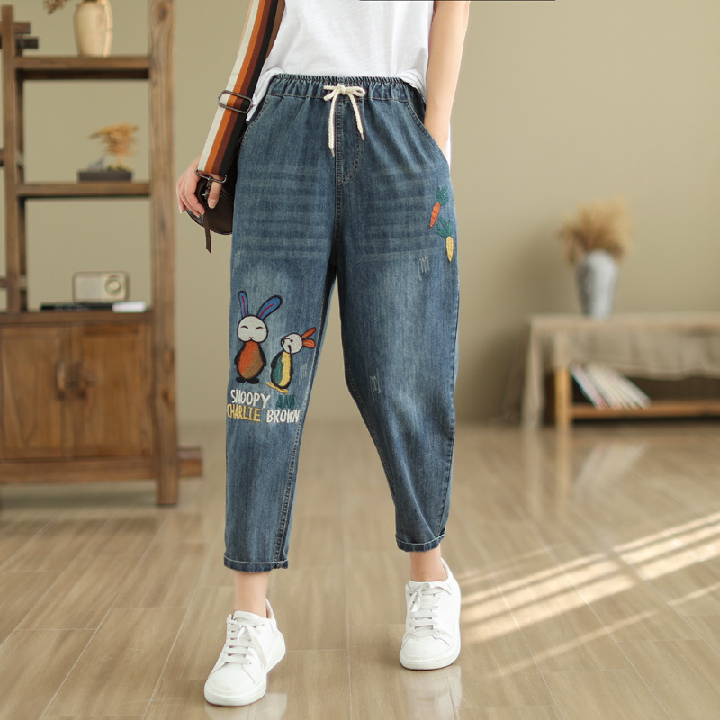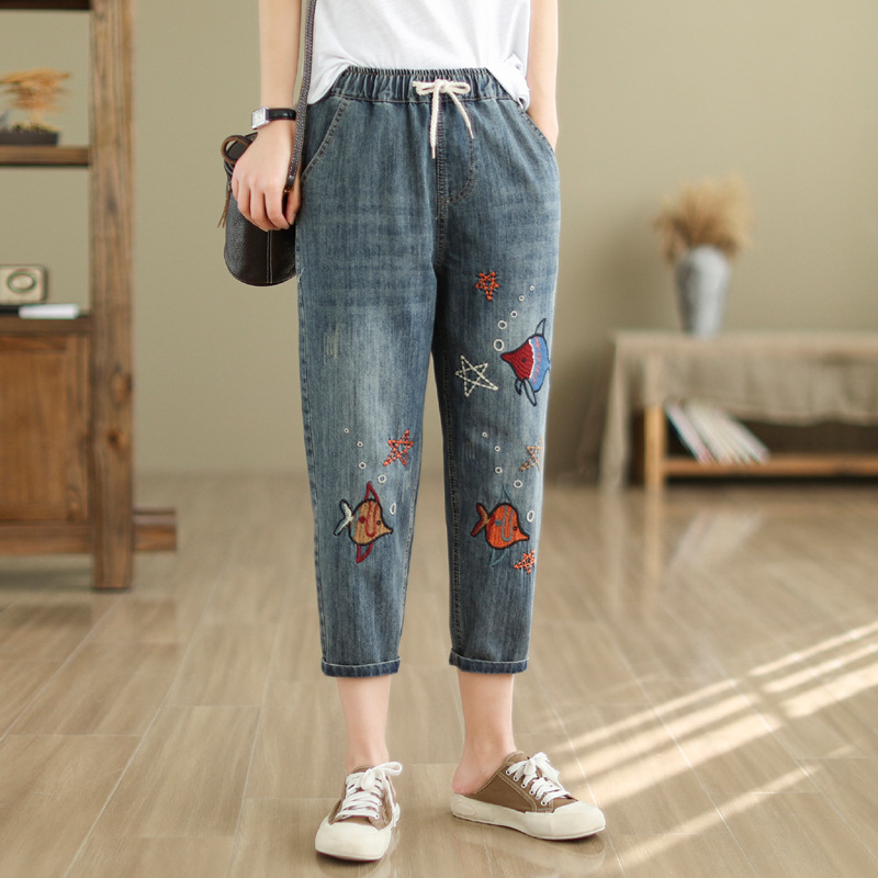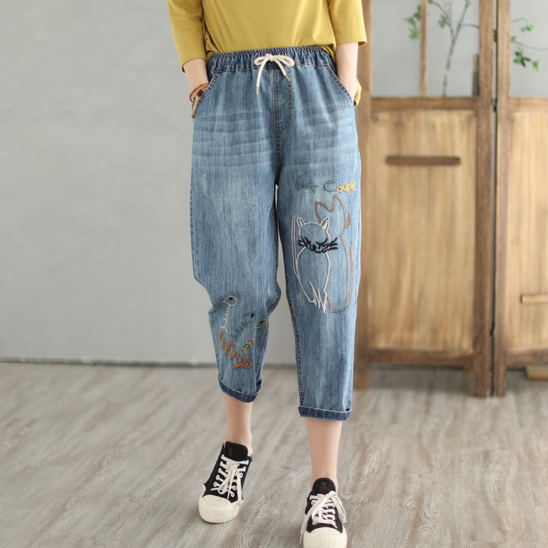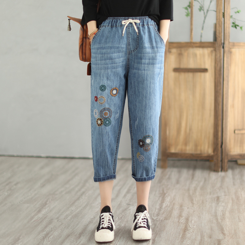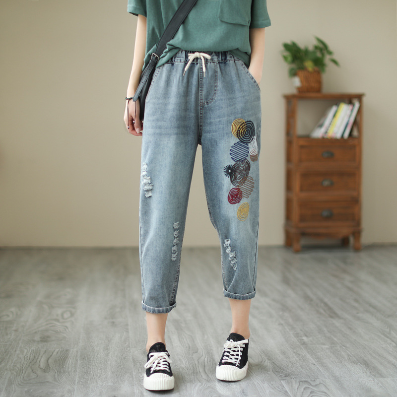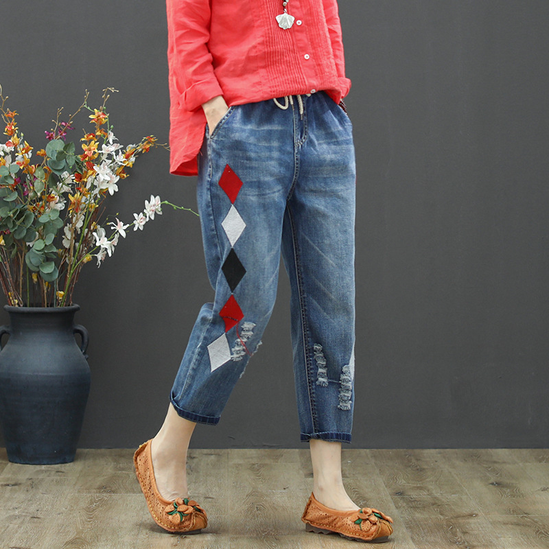 • 春秋新款女士牛仔裤刺绣松紧腰破洞大码哈伦裤女式牛仔绣花七分裤折扣价:52