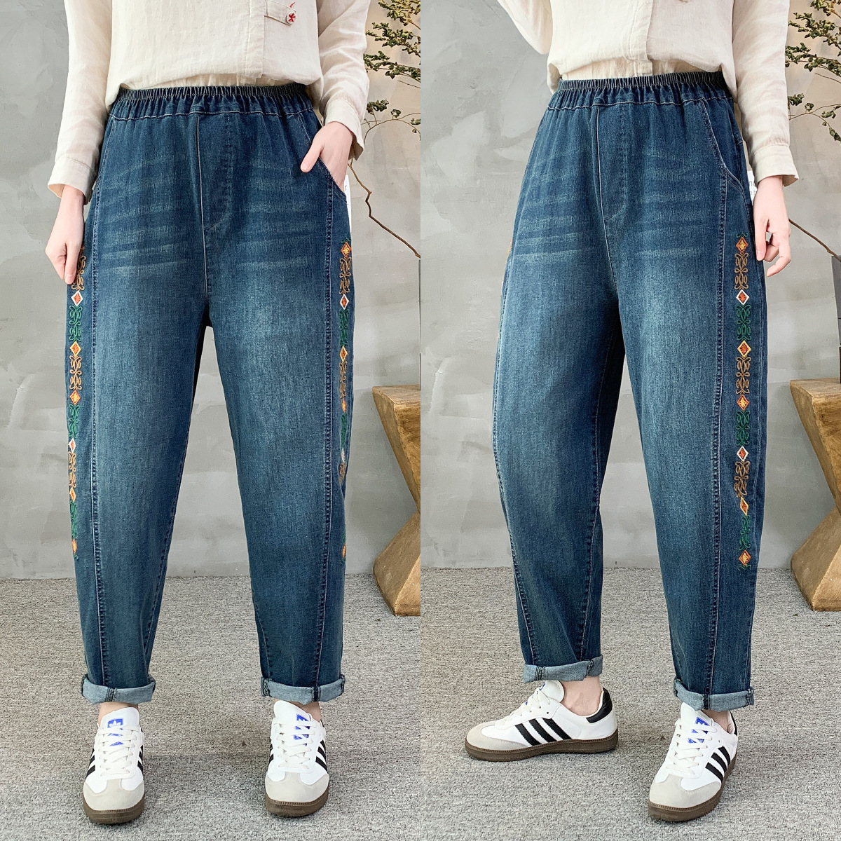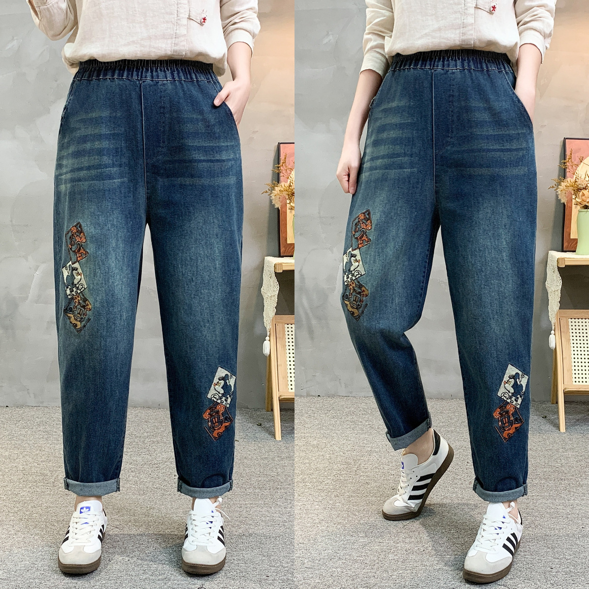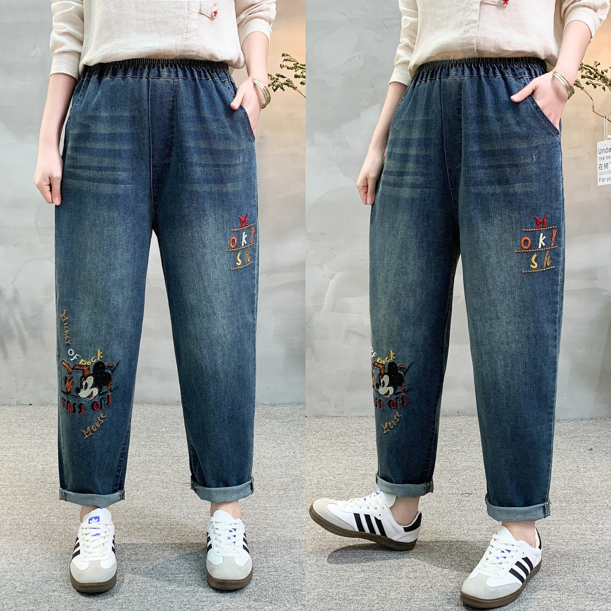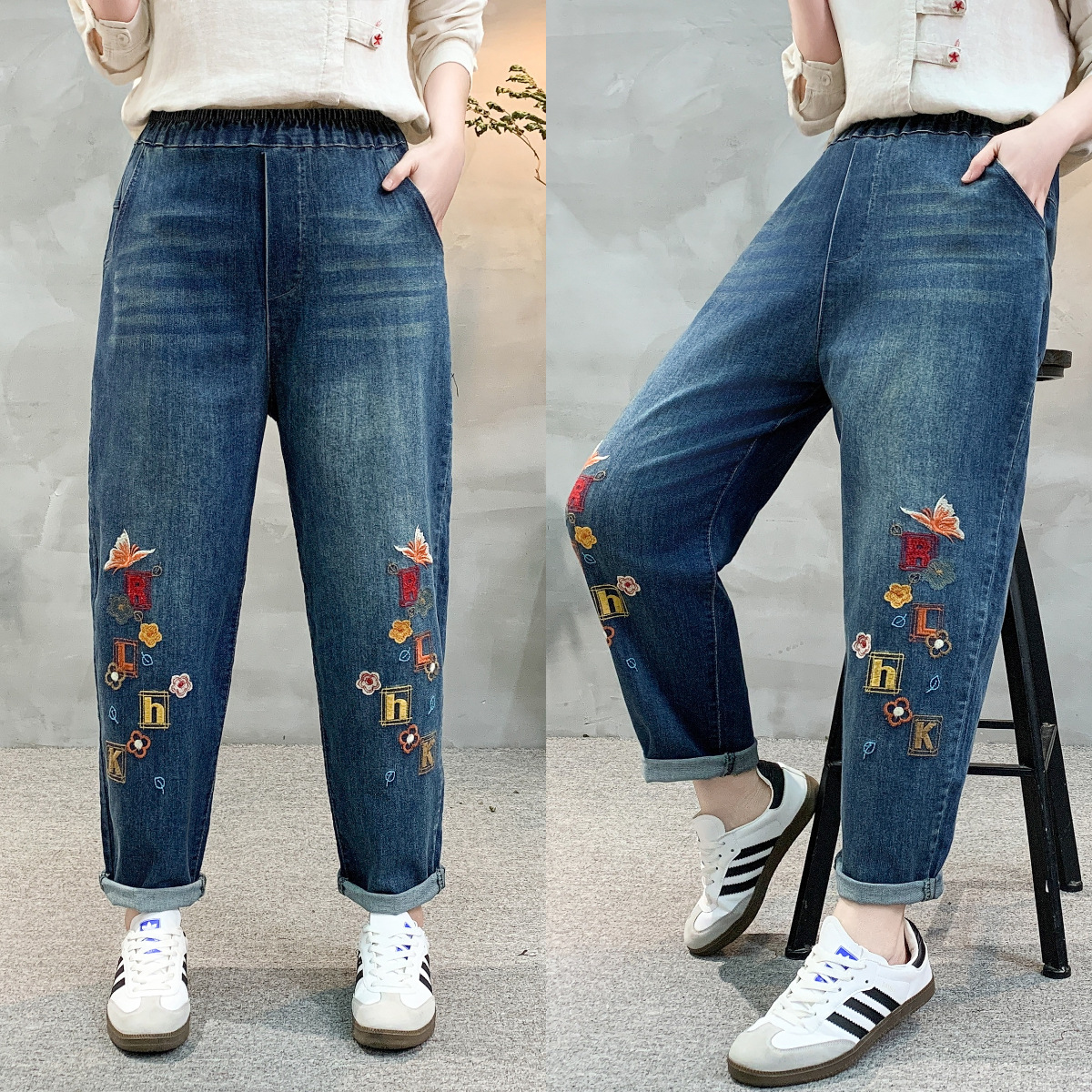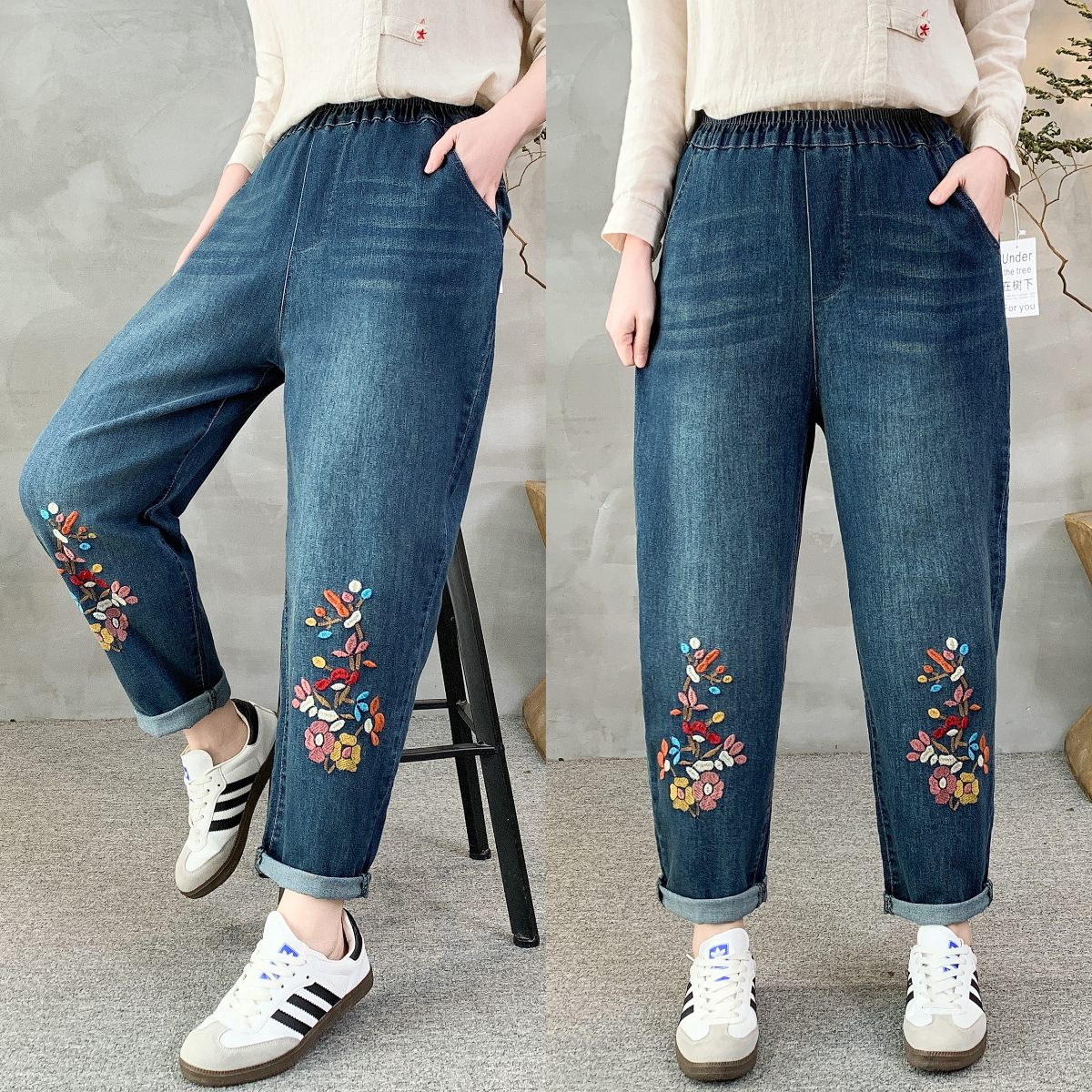 • 春秋新款女士牛仔裤刺绣松紧腰破洞大码哈伦裤女式牛仔绣花七分裤折扣价:52