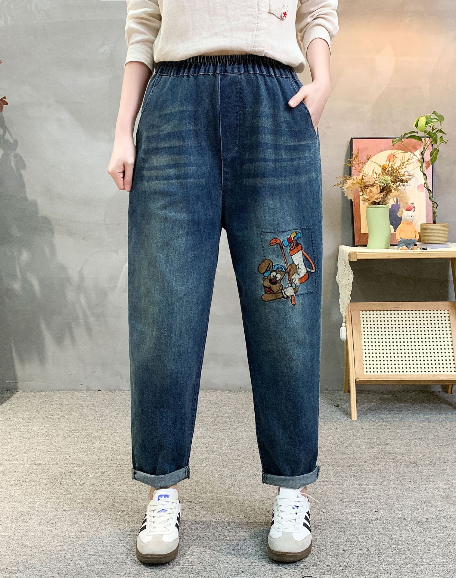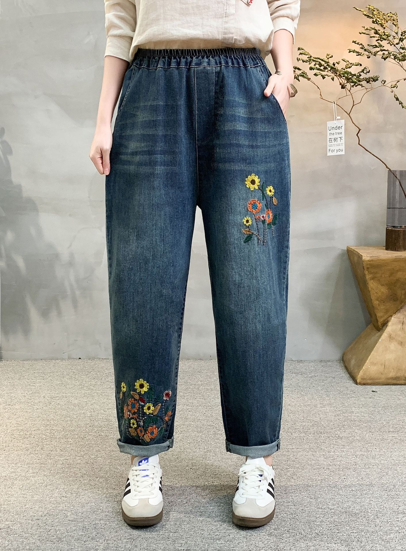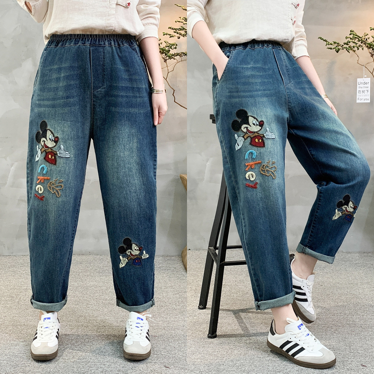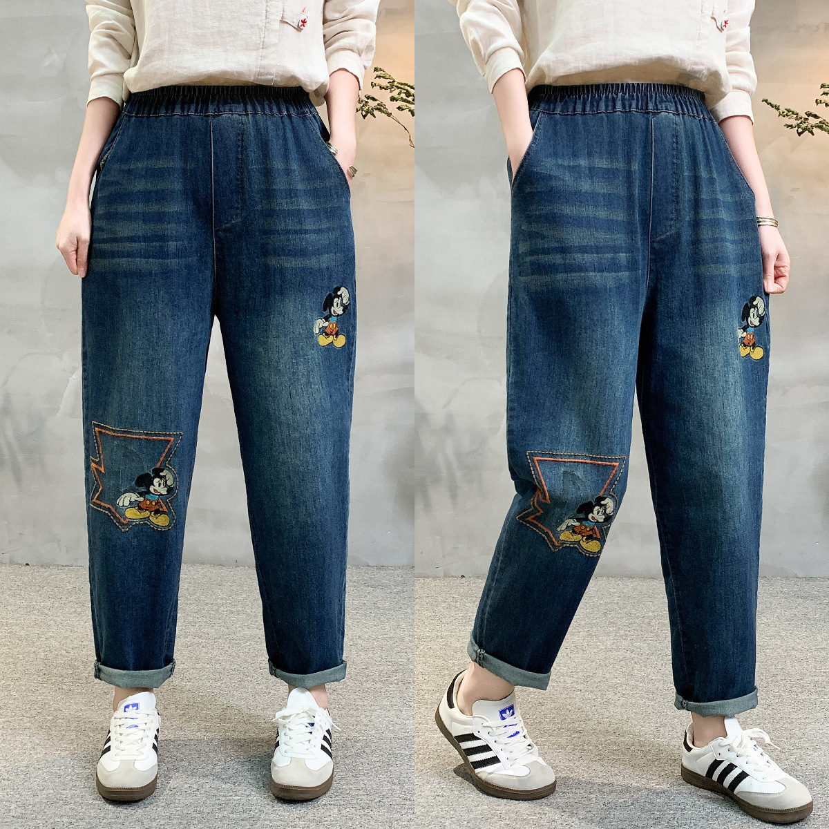 • 春秋新款女士牛仔裤刺绣松紧腰破洞大码哈伦裤女式牛仔绣花七分裤折扣价:52