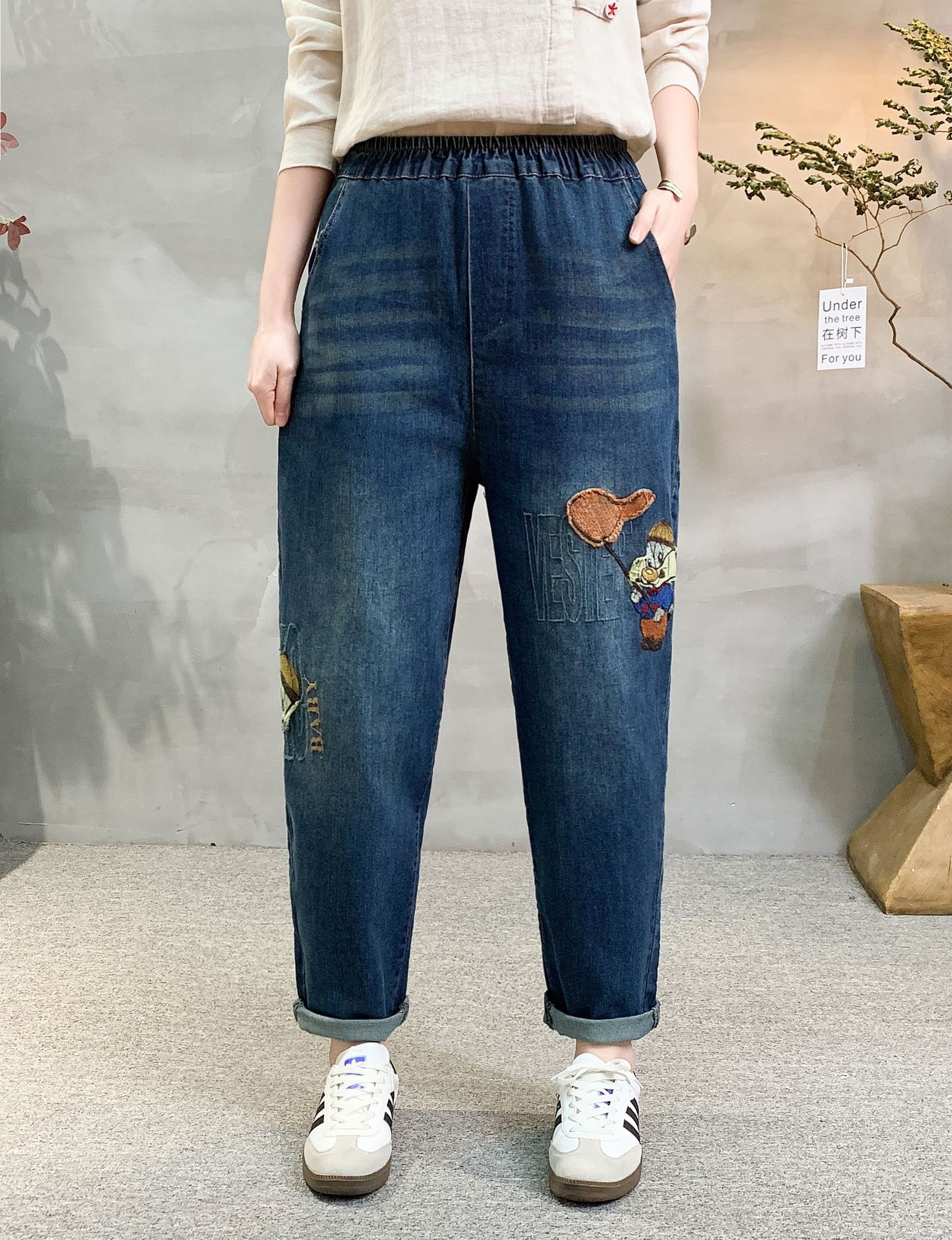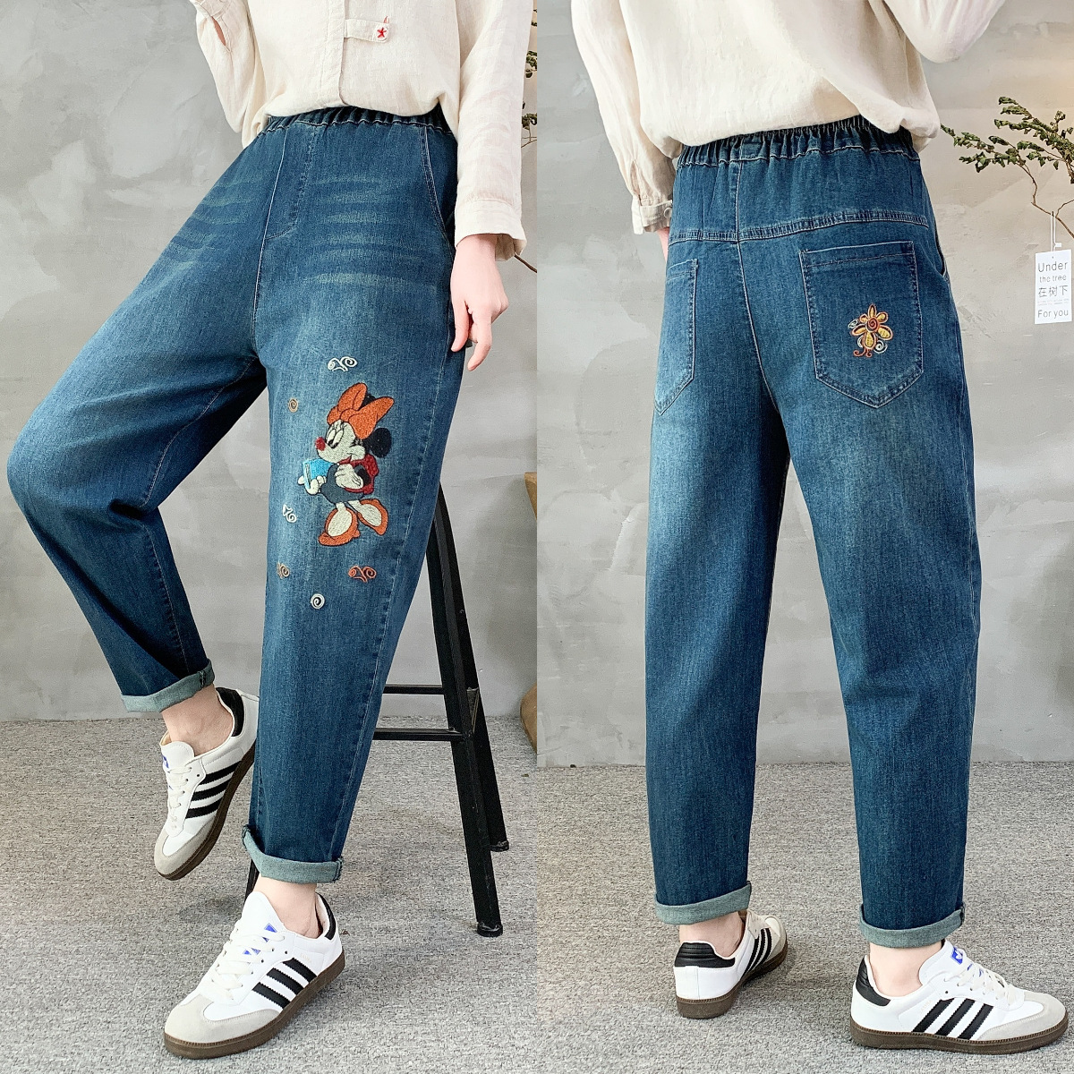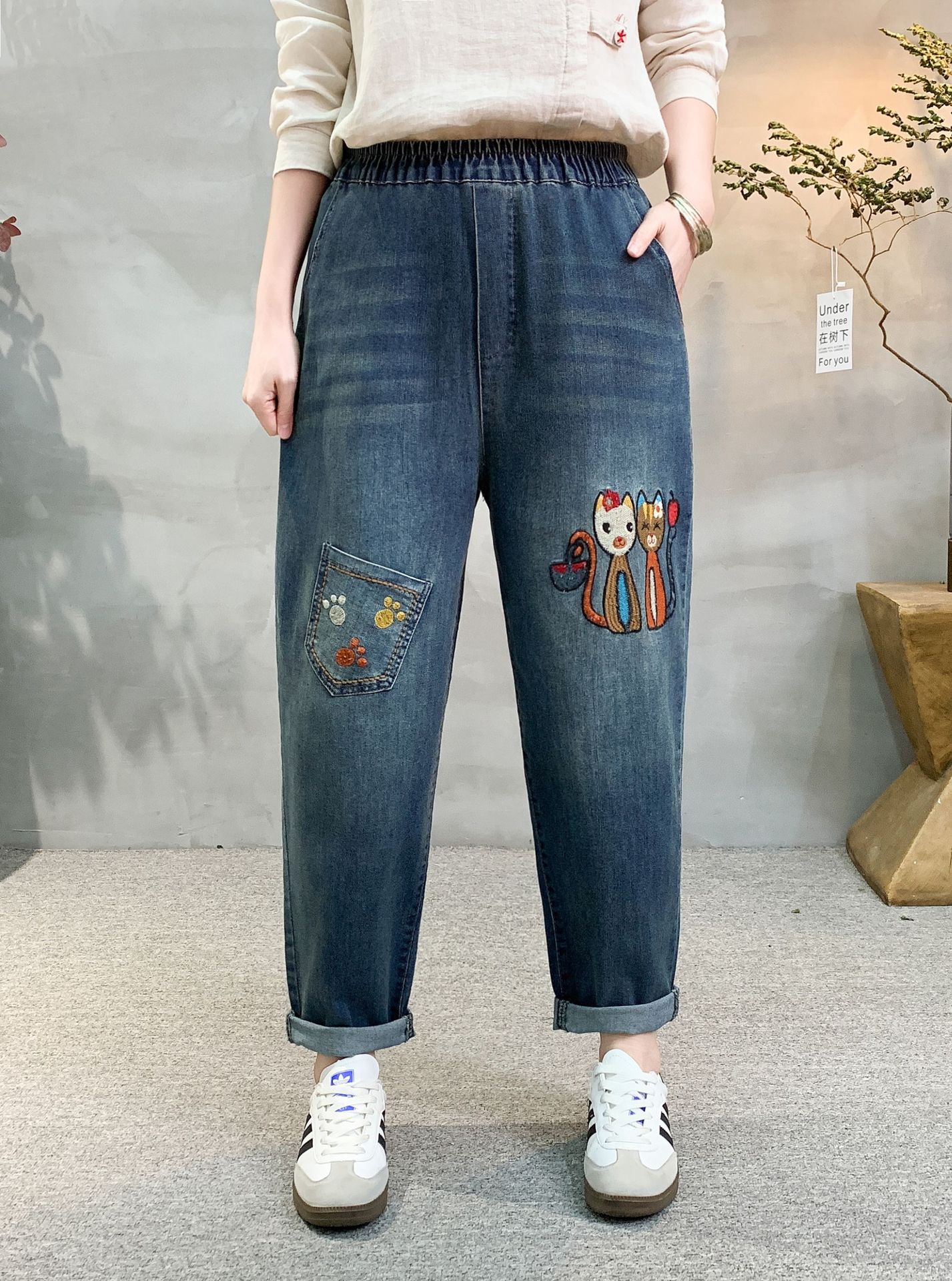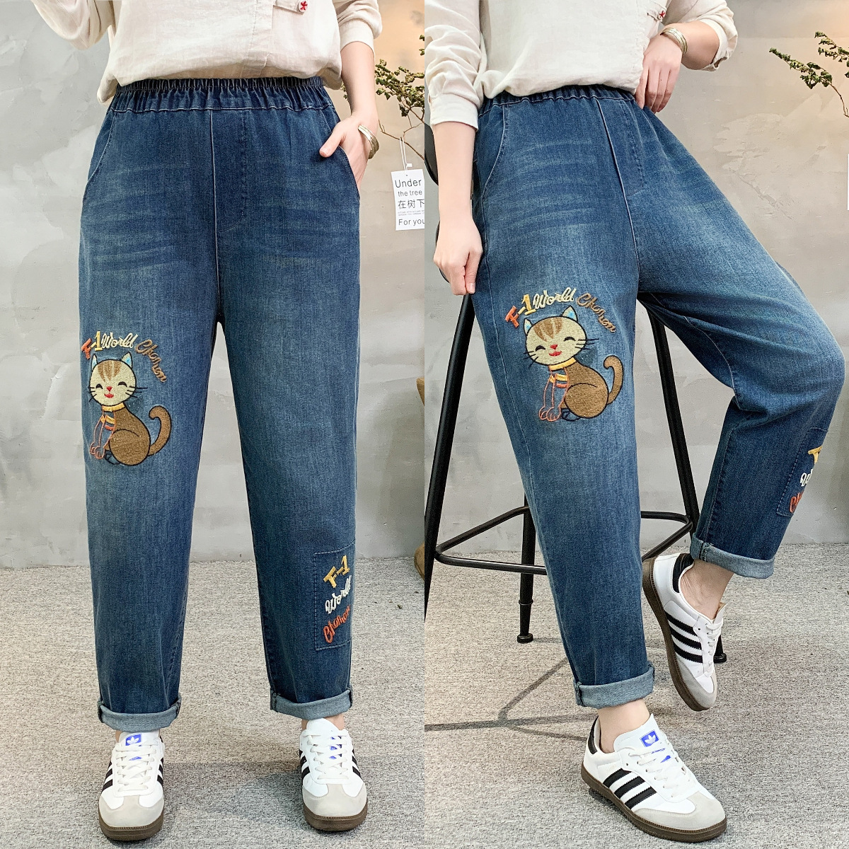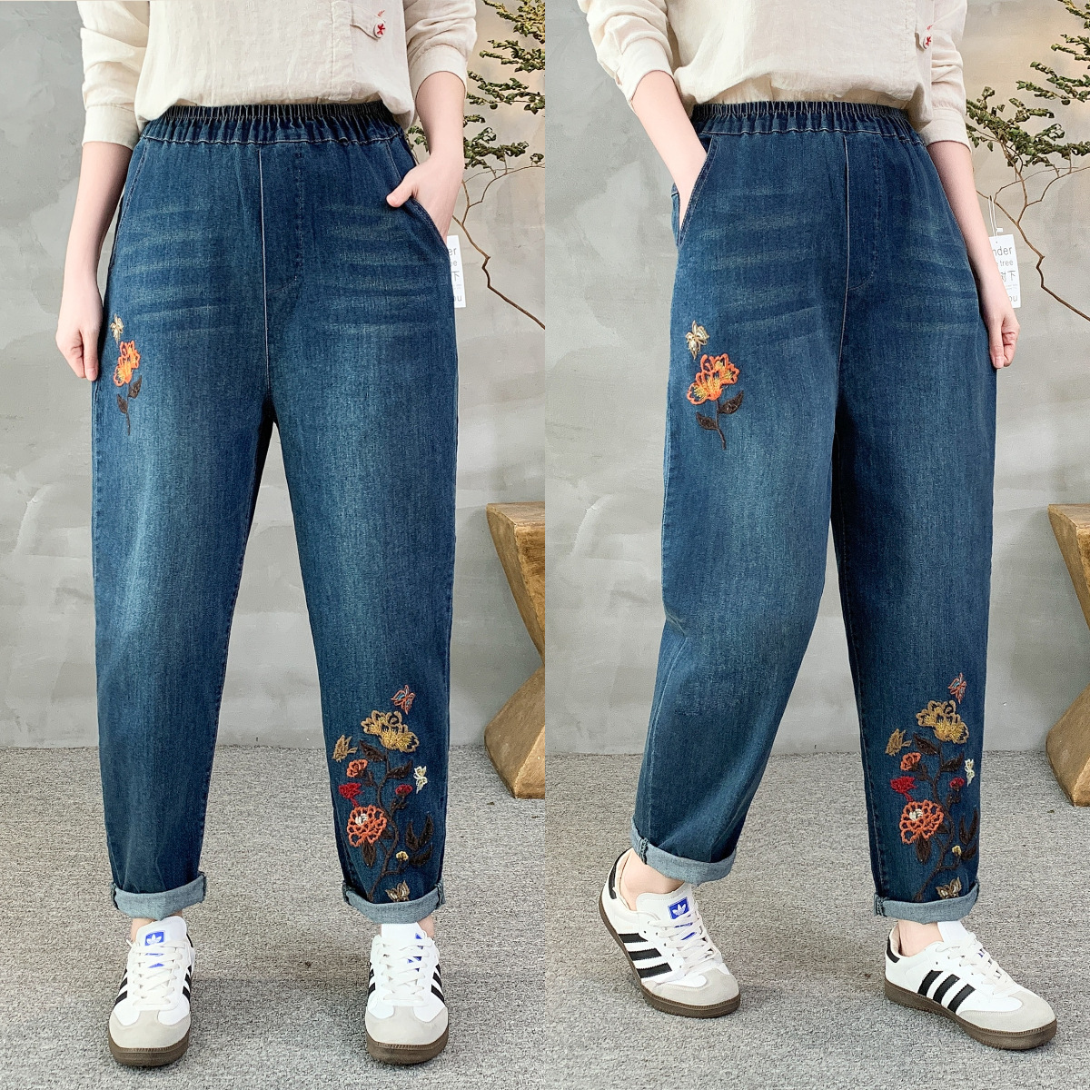 • 牛仔裤女2021春秋季新款复古刺绣松紧腰系带宽松牛仔裤女长裤大码53折扣价:53