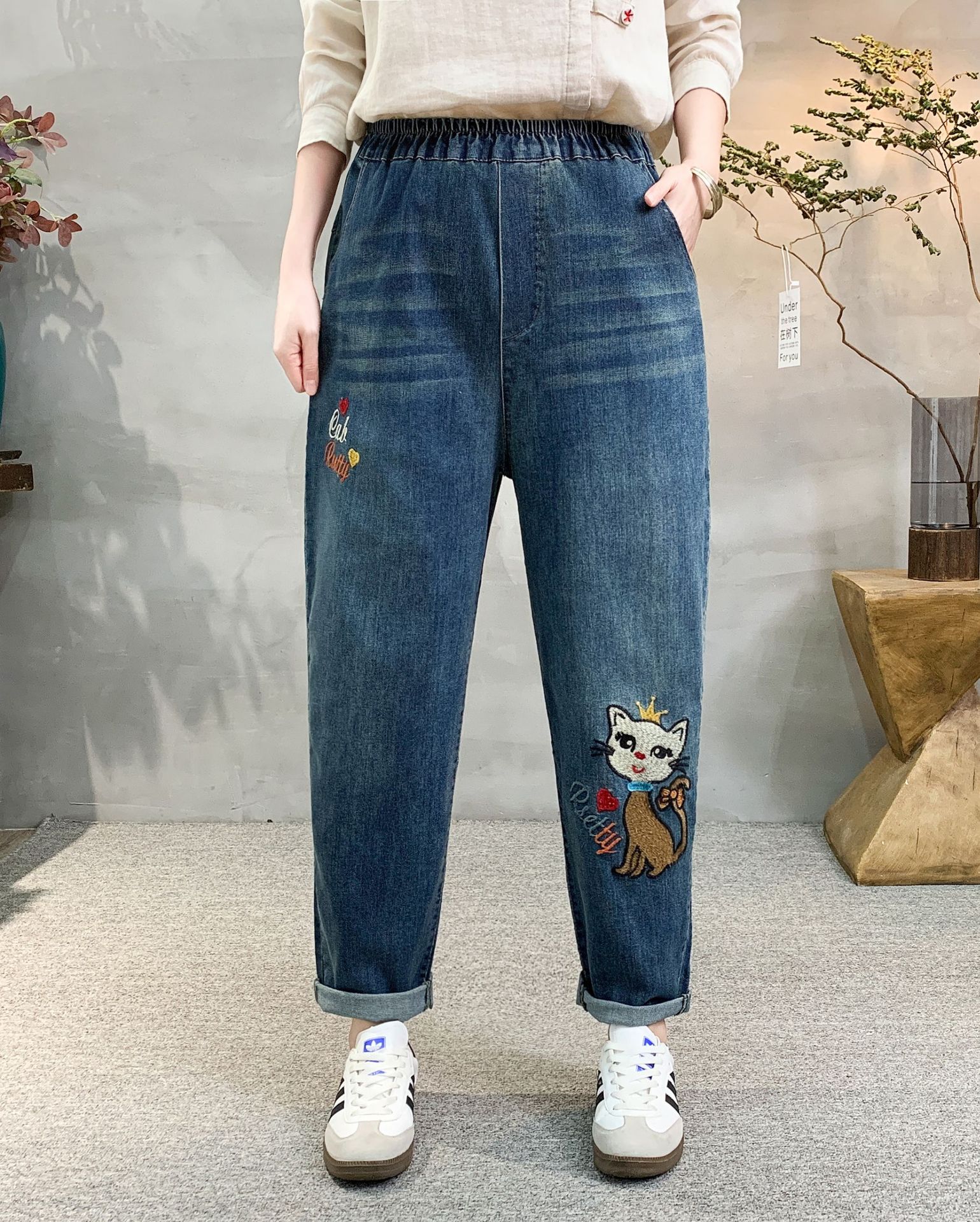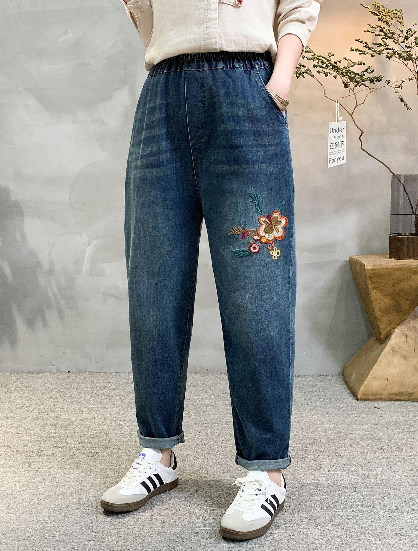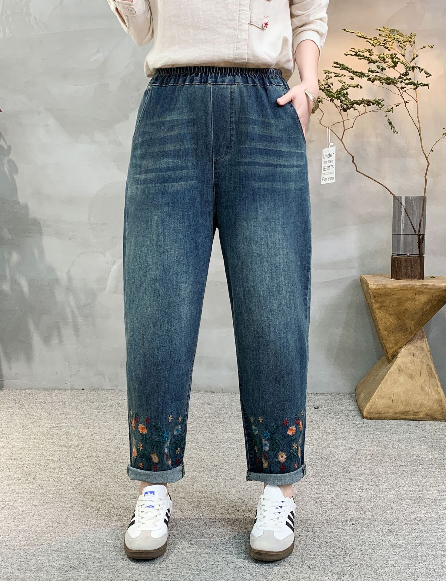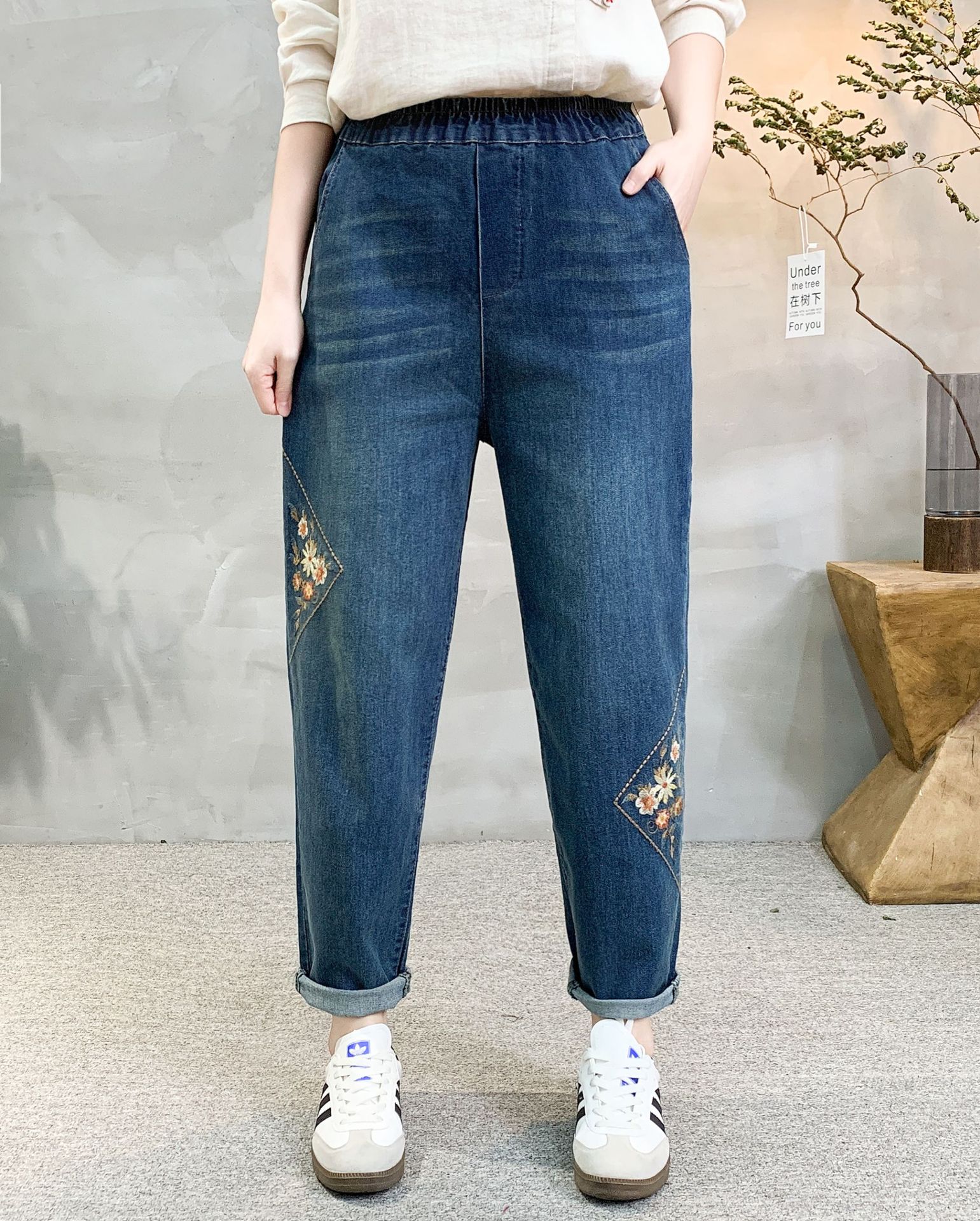 • 牛仔裤女2021春秋季新款复古刺绣松紧腰系带宽松牛仔裤女长裤大码53折扣价:53