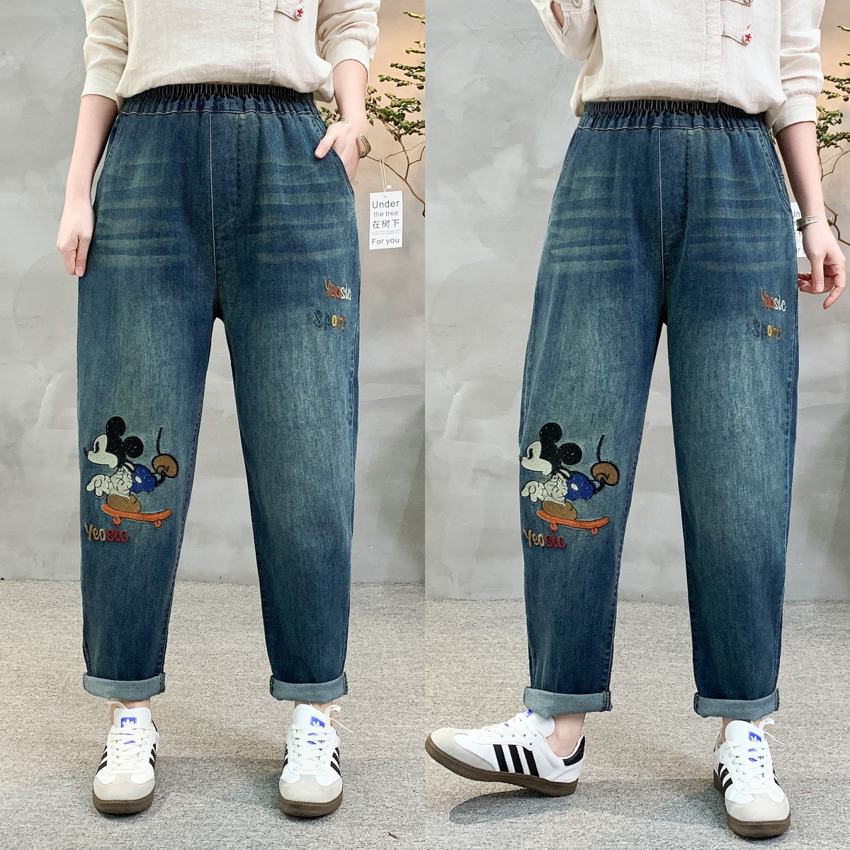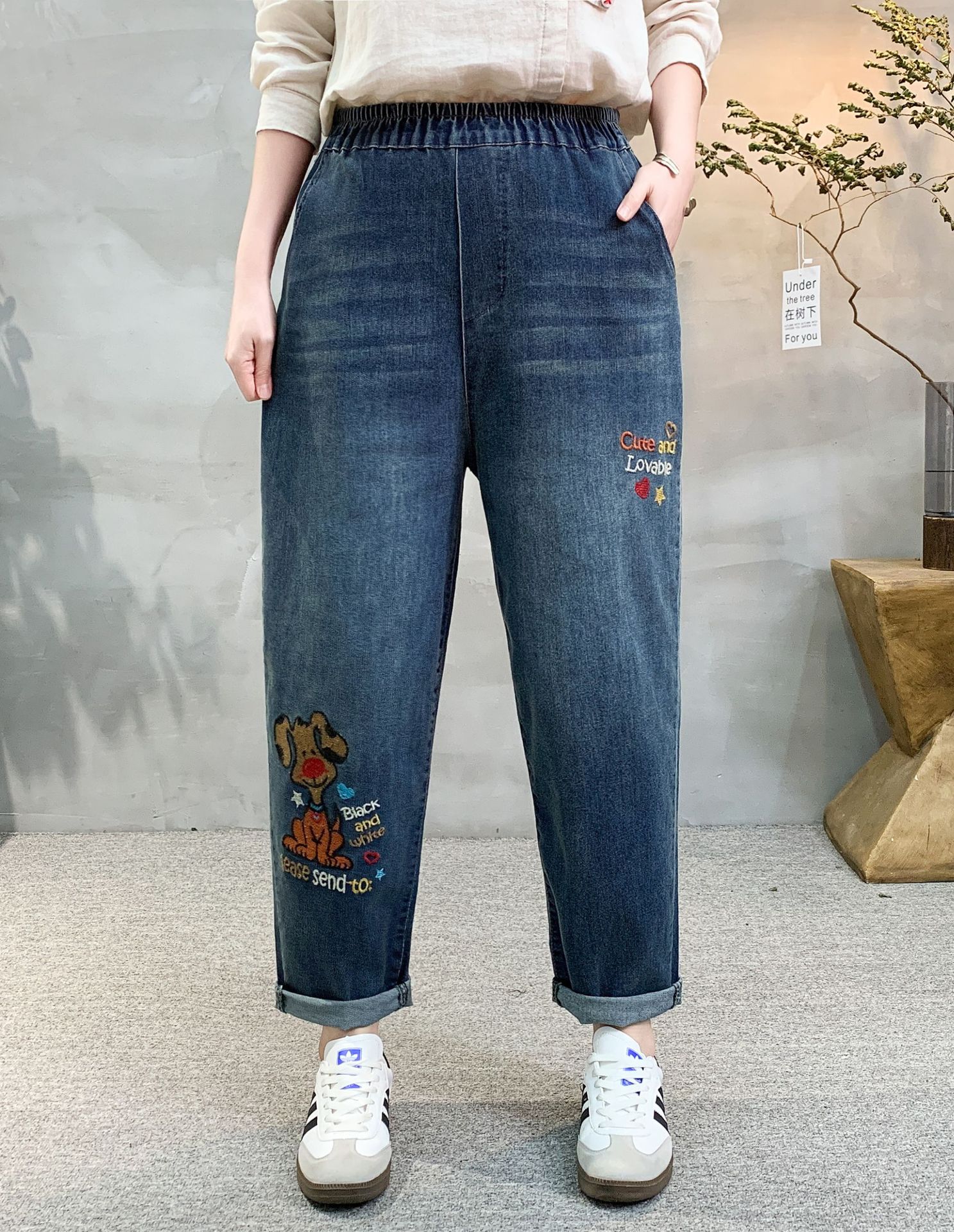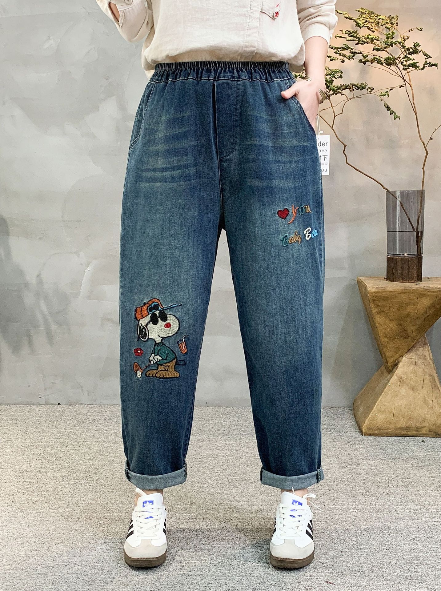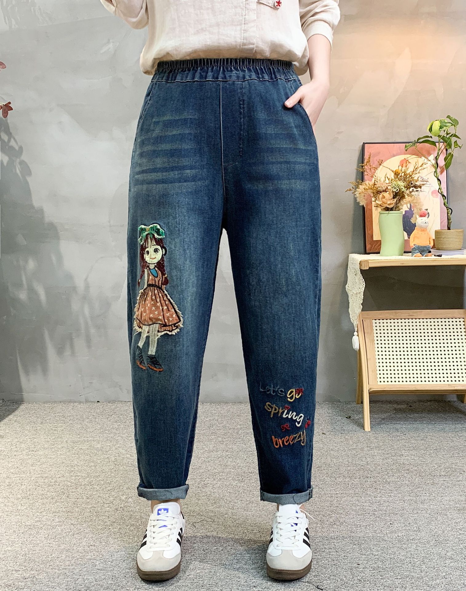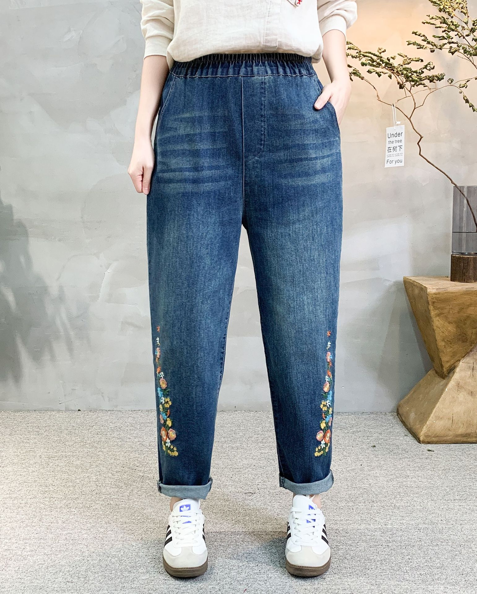 • 牛仔裤女2021春秋季新款复古刺绣松紧腰系带宽松牛仔裤女长裤大码53折扣价:53