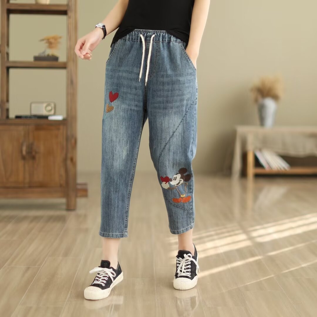• 女裤春夏新款休闲磨破刺绣卡通蓝色七分裤系带宽松牛仔裤女松紧腰折扣价:51