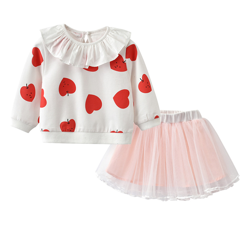 봄과 가을 새로운 한국 스타일 여아 스커트 세트 로터스 칼라 러브 티셔츠 베이스 셔츠 거즈 스커트 공주 스커트 투피스 세트