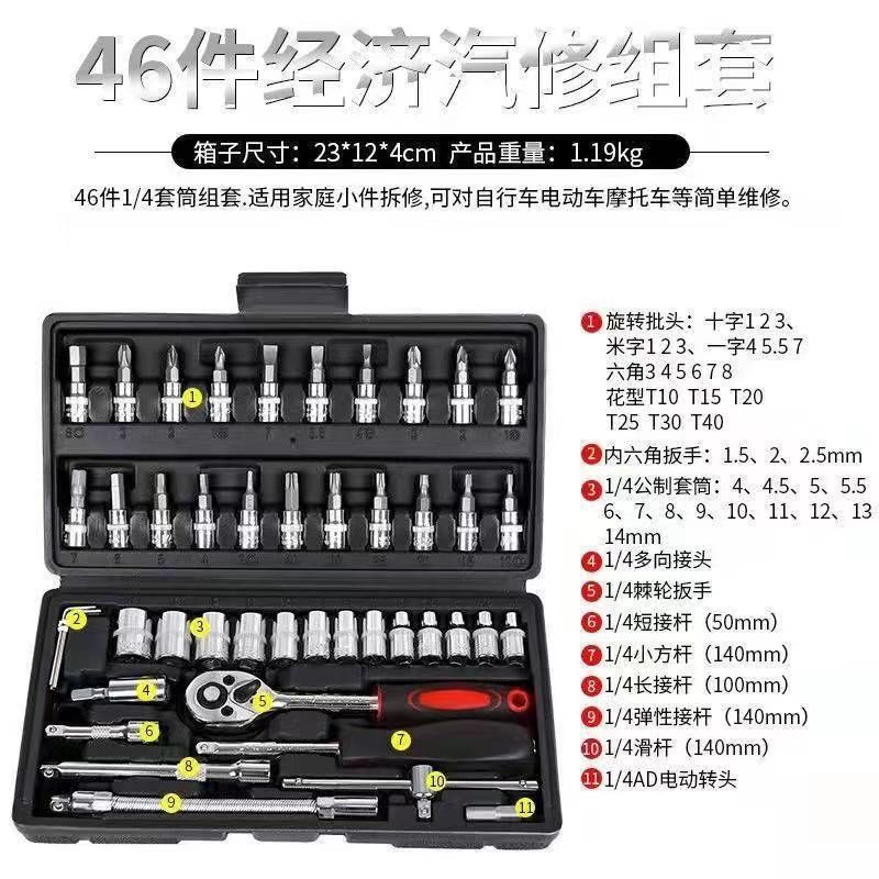 46 조각 조합 도구 자동 수리 소켓 렌치 작은 비행 래칫 렌치 1/4 세트 기계 수리 키트