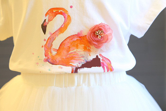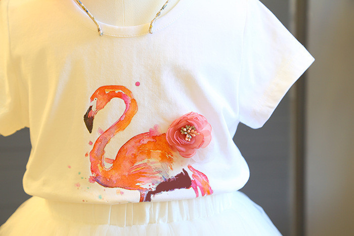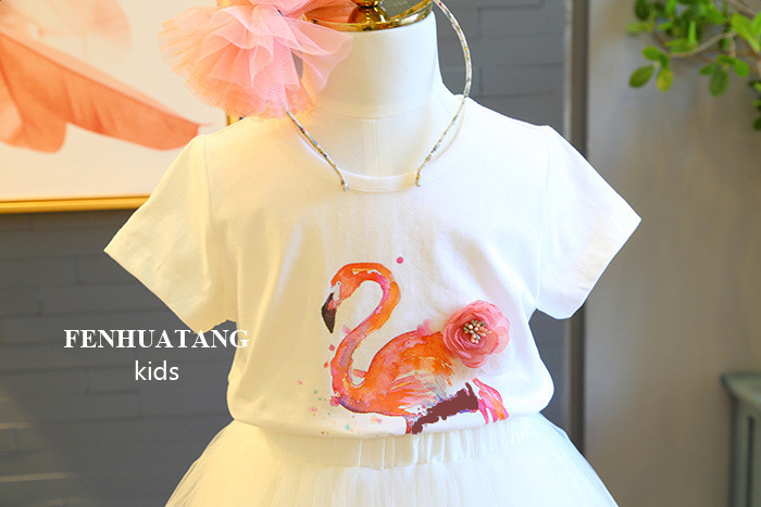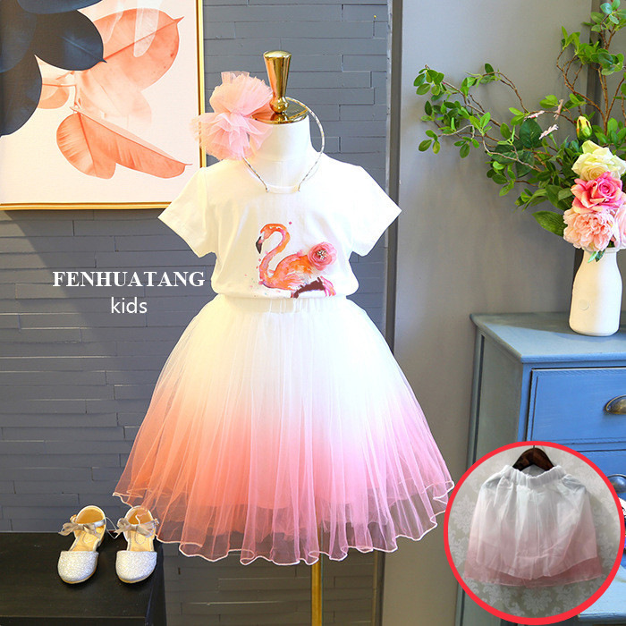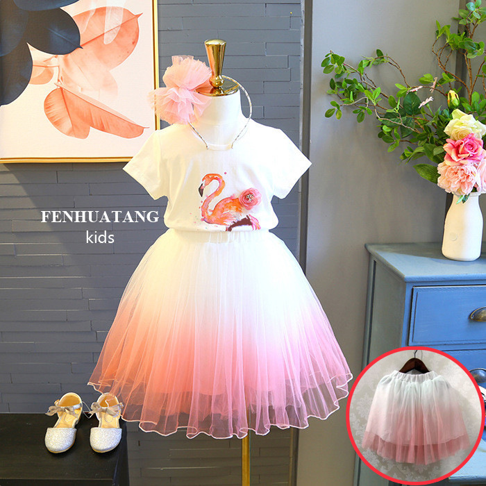 폭발 2020 여름 여성 아동복 플라밍고 반팔 티셔츠 + 조커 그라데이션 소녀의 원피스 투피스 세트