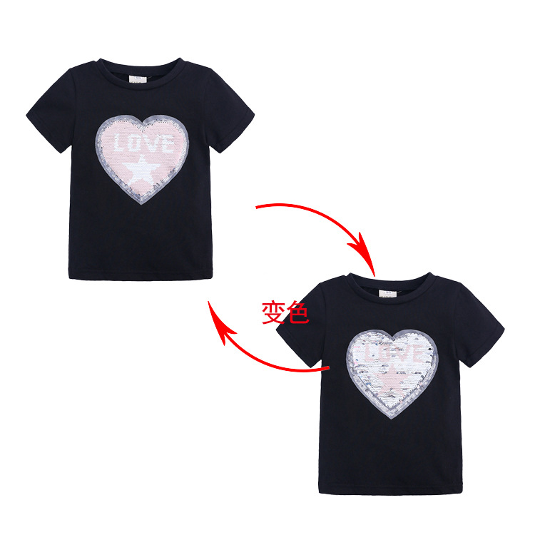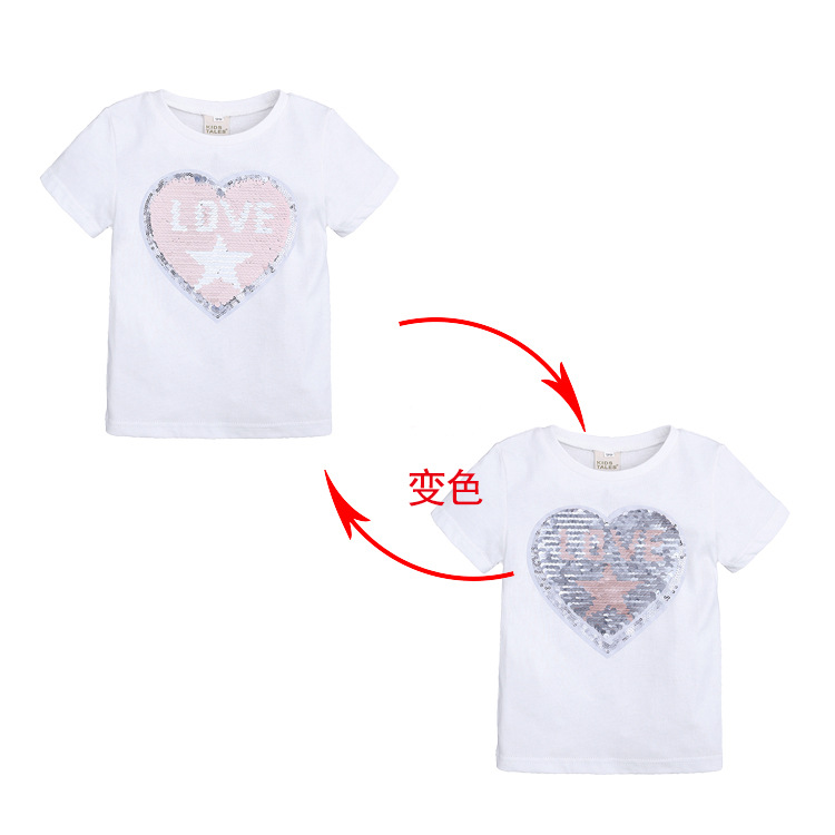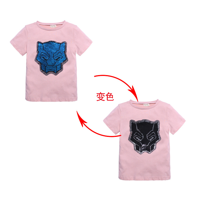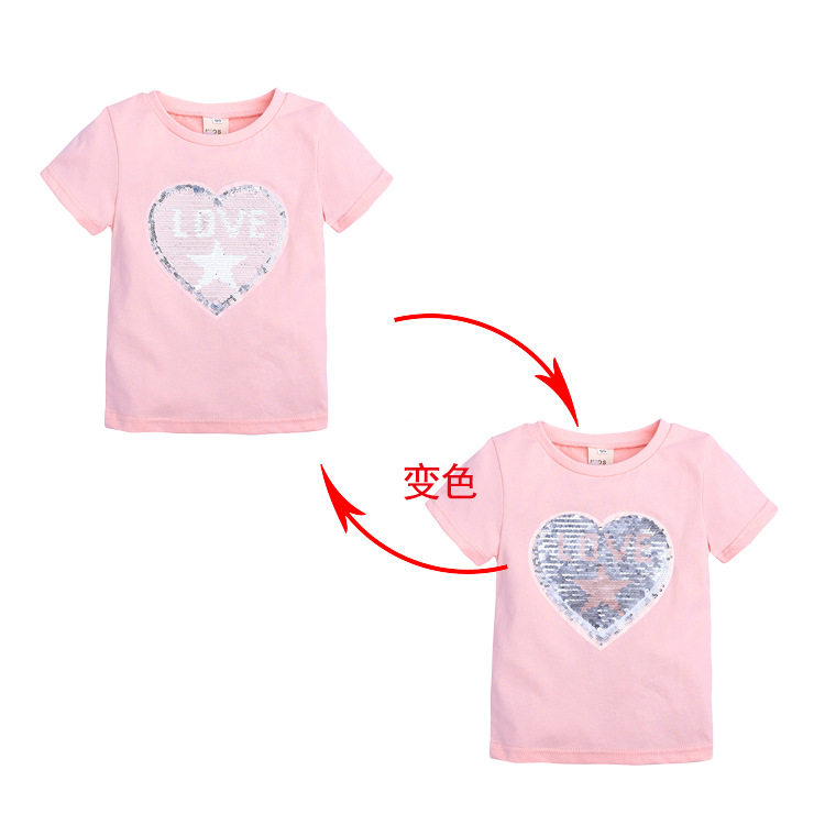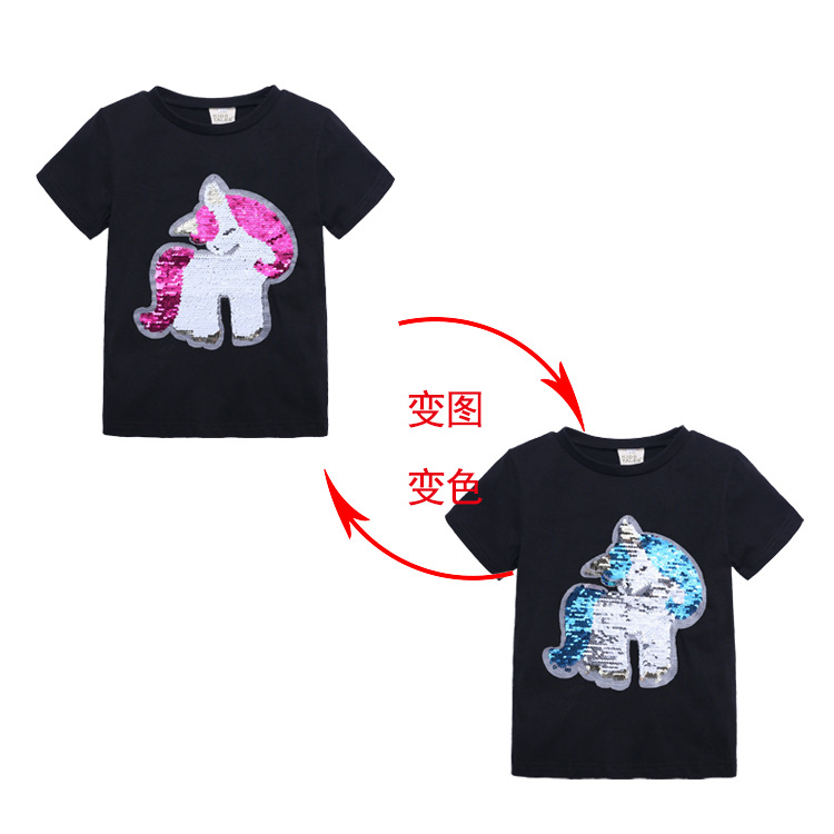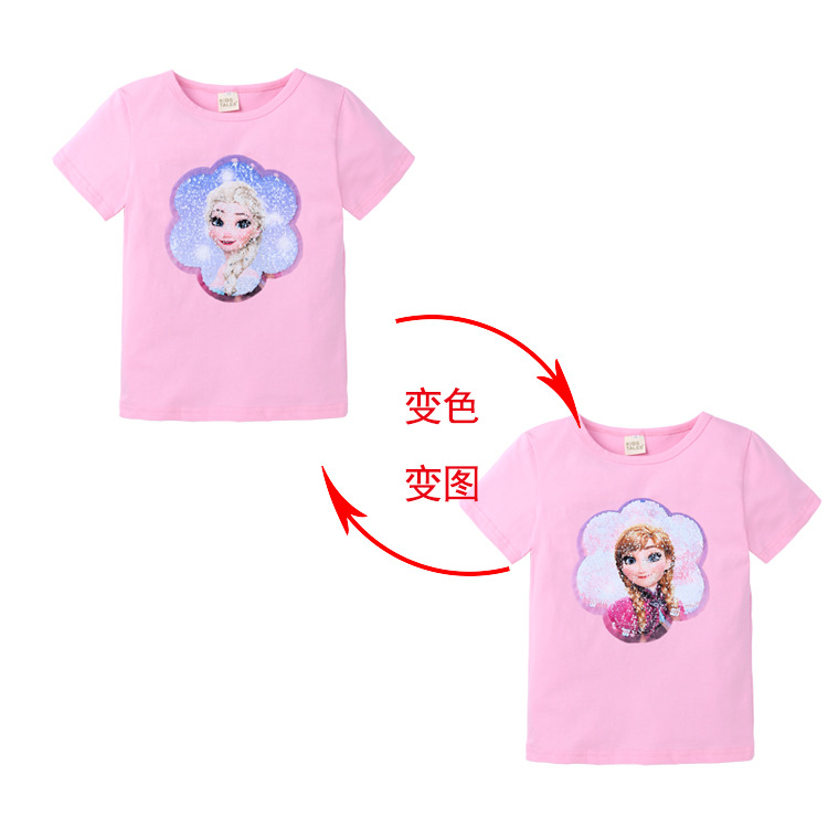 【款式】儿童夏季新款亮片翻面变色变脸卡通棉T恤男女童潮范打底衫
