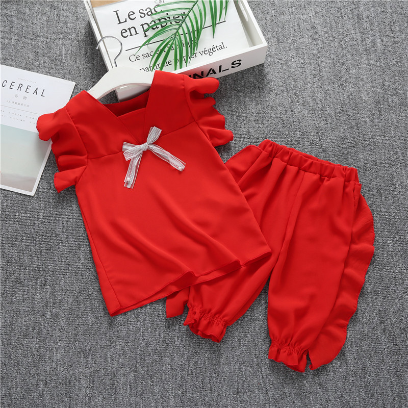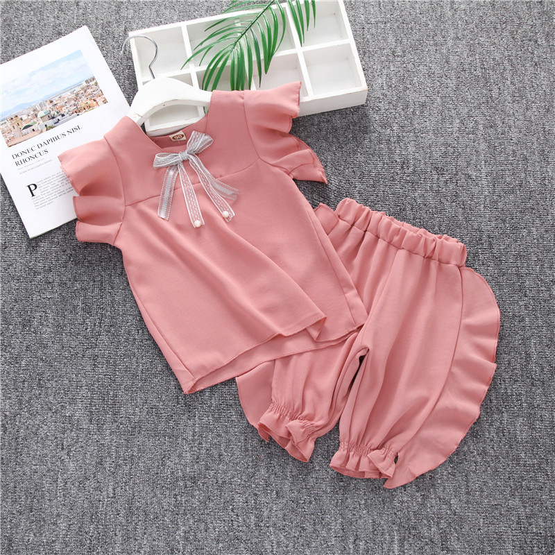 2019 새로운 여자 여름 세트 여자 아기 옷 한국 티셔츠 반바지 어린이 비행 슬리브 투피스 세트